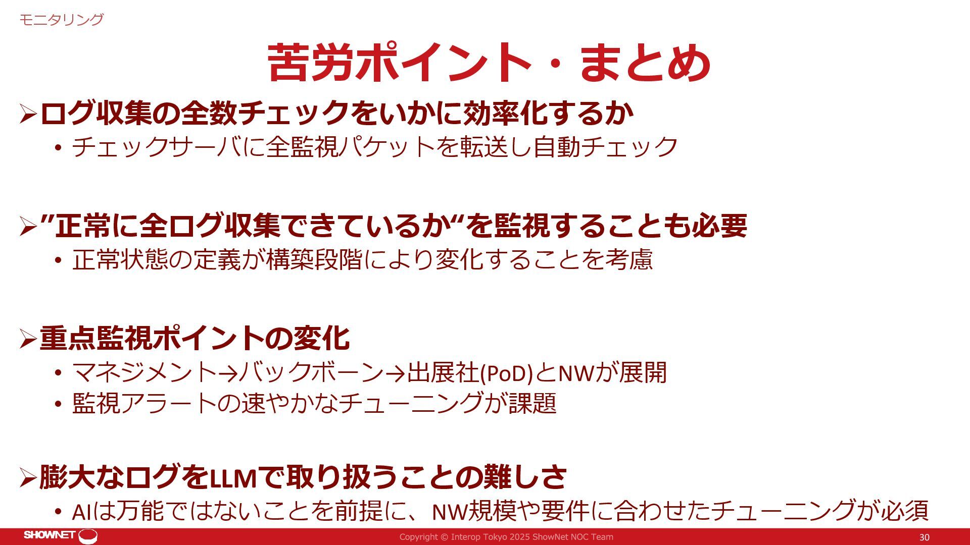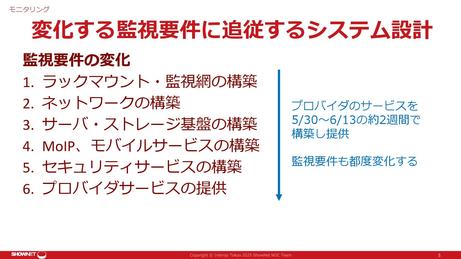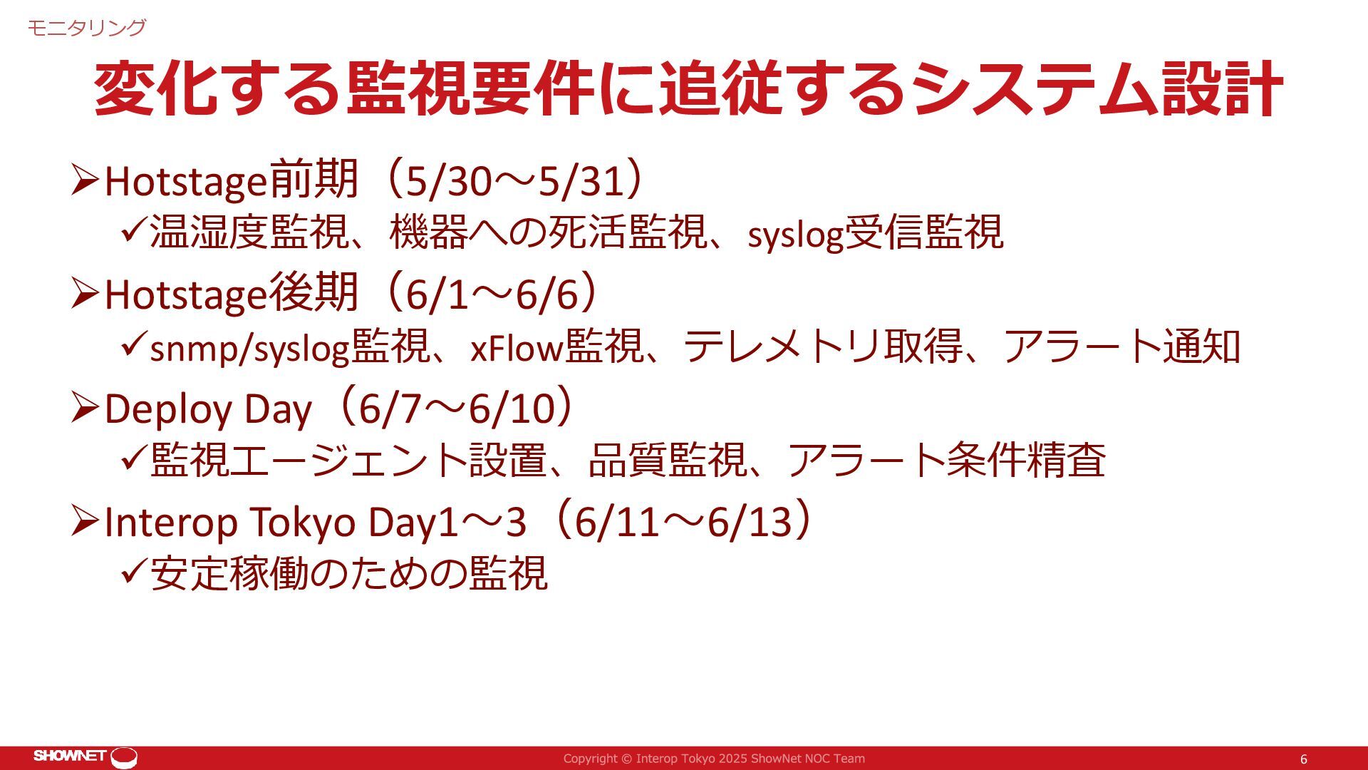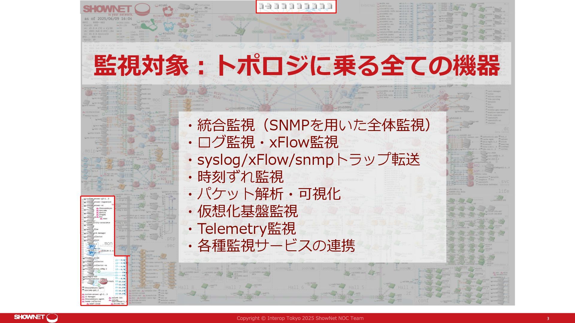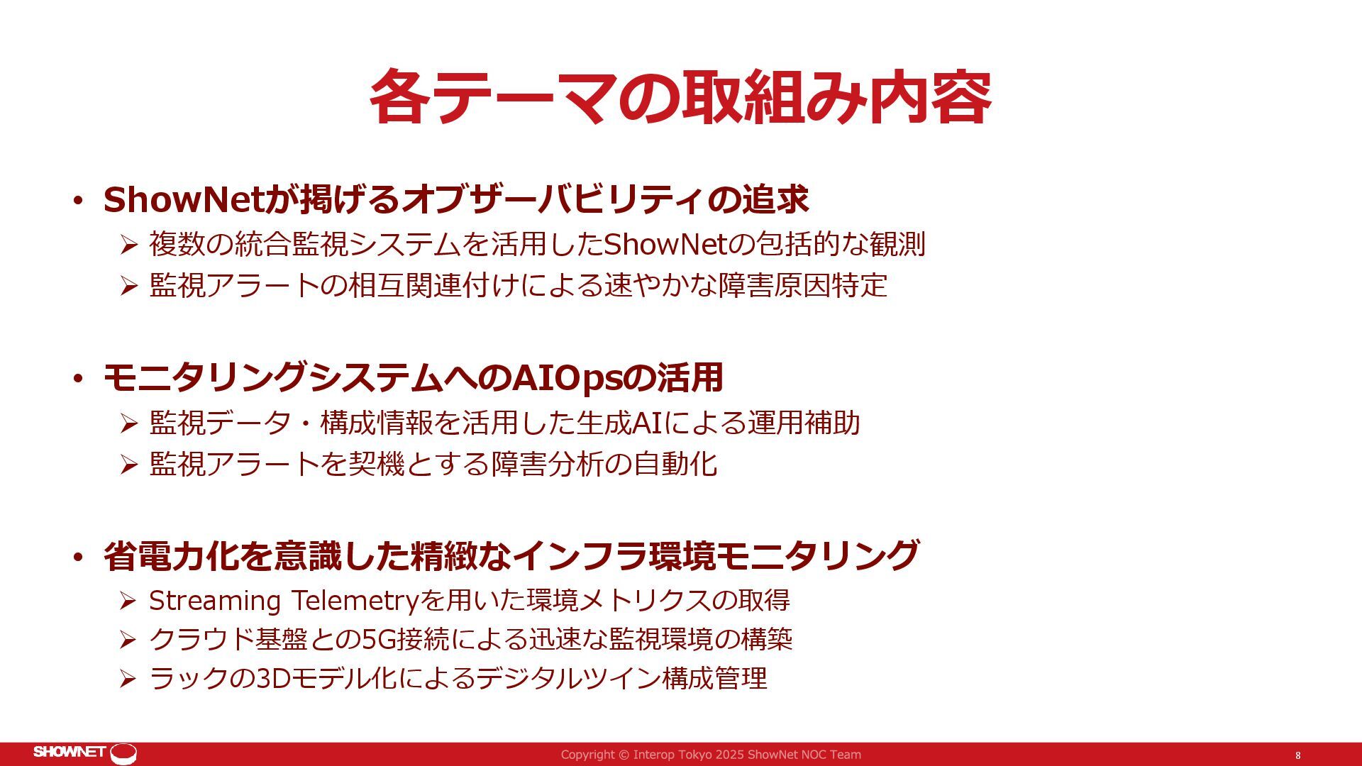 本セッションでは、ShowNet 2025の監視システムのコンセプトと構築過程、そして監視運用で可視化した結果をご紹介します。