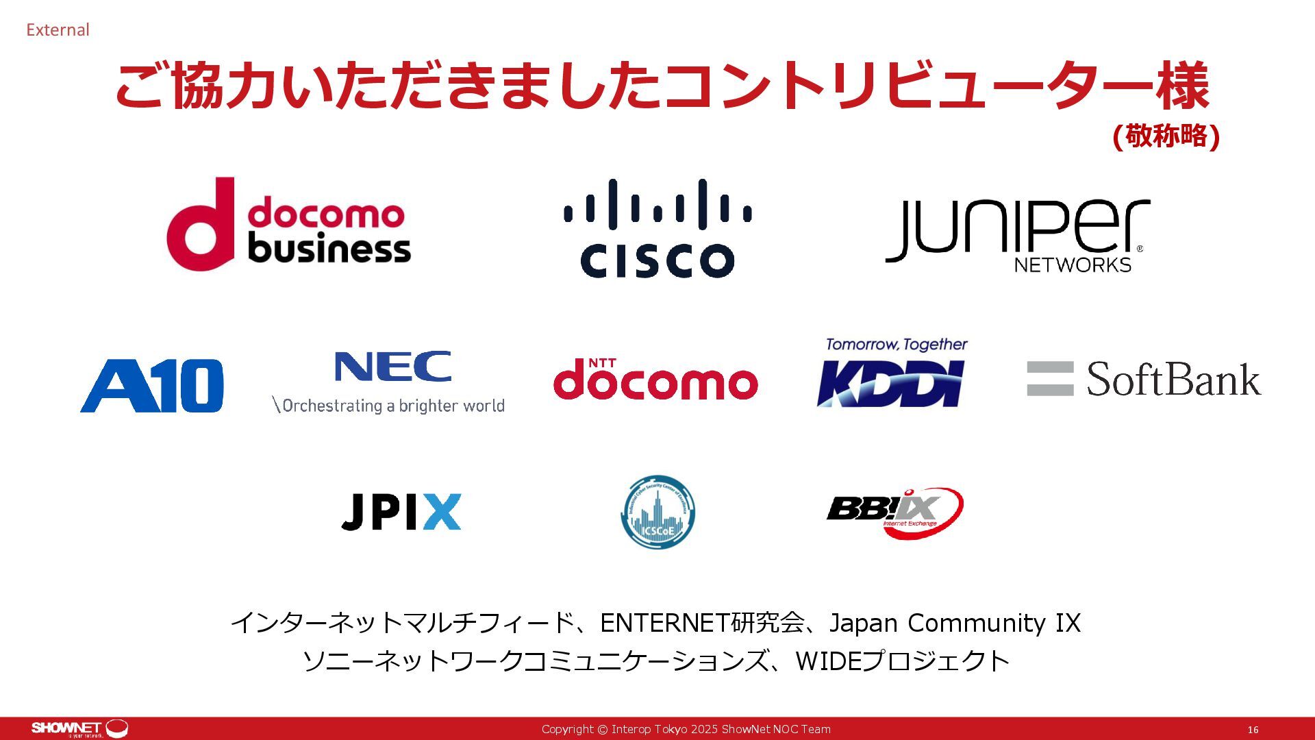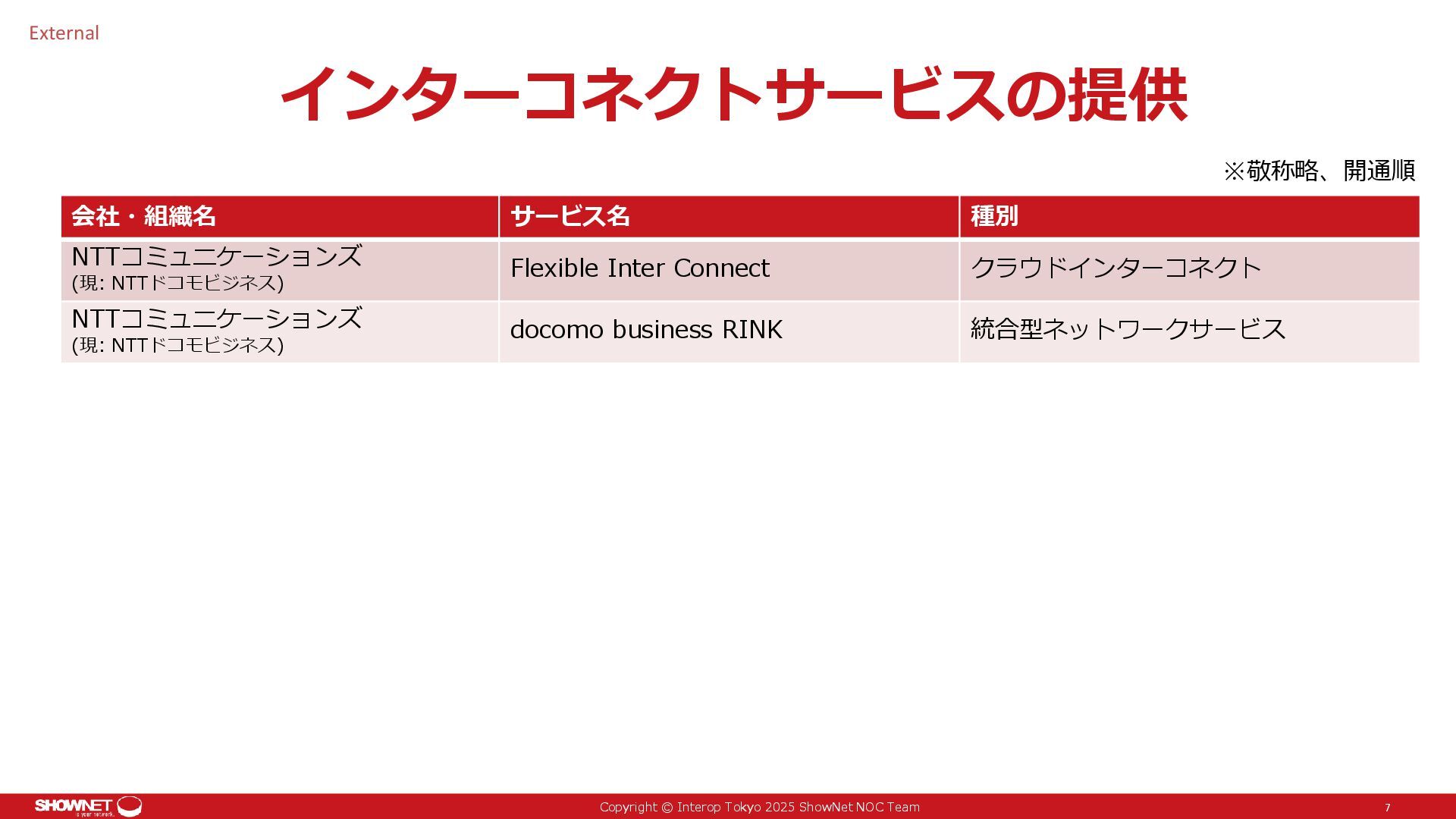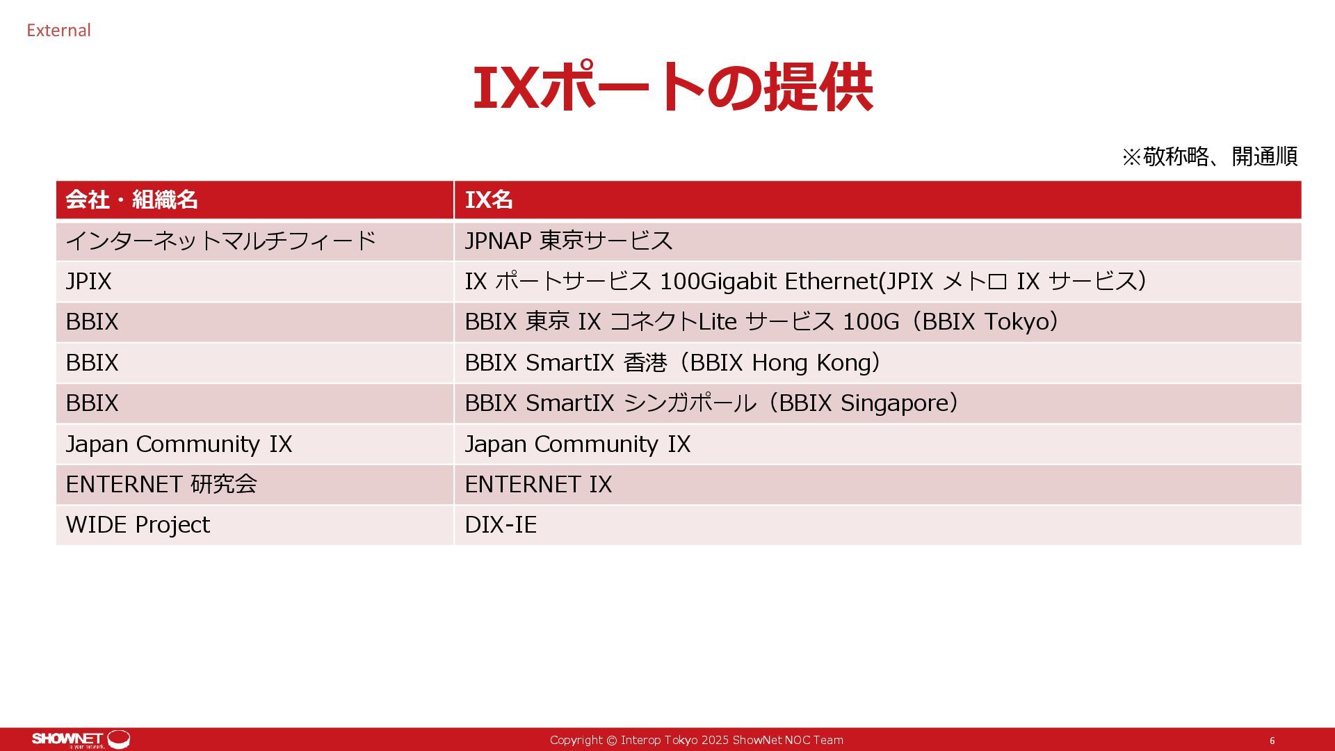 6 会社・組織名 IX名 インターネットマルチフィード JPNAP 東京サービス JPIX IX ポートサービス 100Gigabit Ethernet(JPIX メトロ IX サービス) BBIX BBIX 東京 IX コネクトLite サービス 100G(BBIX Tokyo) BBIX BBIX SmartIX 香港(BBIX Hong Kong) BBIX BBIX SmartIX シンガポール(BBIX Singapore) Japan Community IX Japan Community IX ENTERNET 研究会 ENTERNET IX WIDE Project DIX-IE ※敬称略、開通順