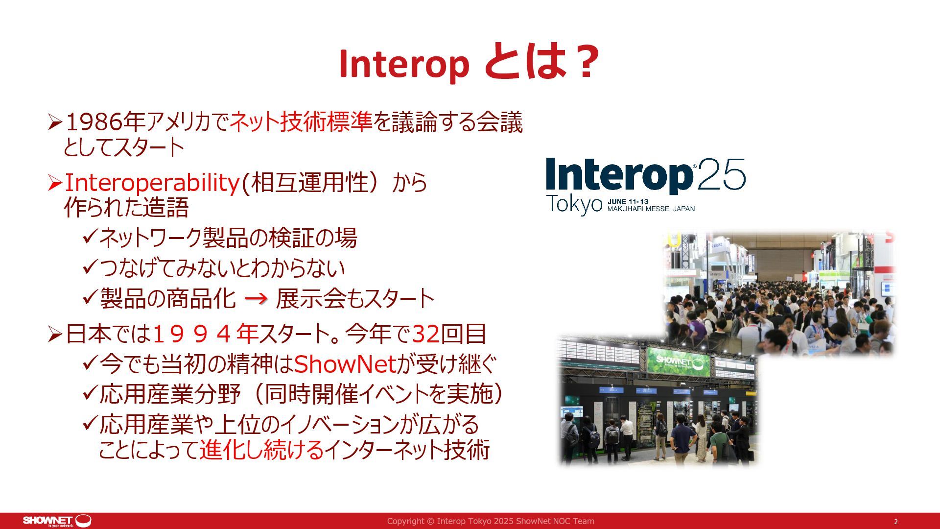 1. Interop とは? ➢1986年アメリカでネット技術標準を議論する会議 としてスタート ➢Interoperability(相互運用性)から 作られた造語 ✓ネットワーク製品の検証の場 ✓つなげてみないとわからない ✓製品の商品化 →