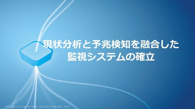 モニタリングテーマ2022 現状分析と予兆検知を融合した監視システムの確立 • 監視データを利用した予兆検知技術の運用への応用 • ハイブリッドクラウドを活用した高可用性な監視システムの実現 • トラフィック解析技術を駆使した進化するネットワーク詳細分析技術 モニタリング