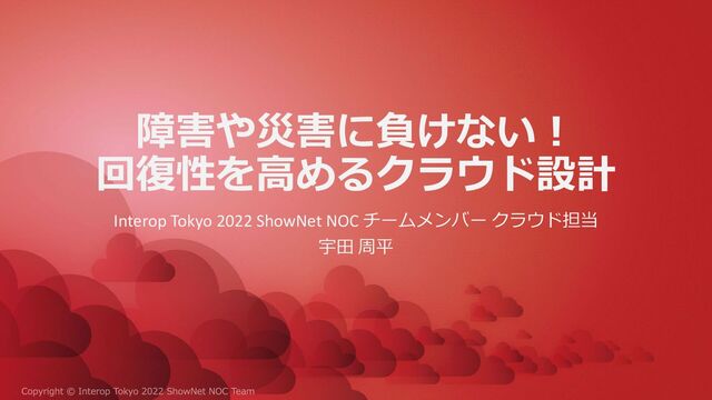 障害や災害に負けない! 回復性を高めるクラウド設計 Interop Tokyo 2022 ShowNet NOC チームメンバー クラウド担当 宇田