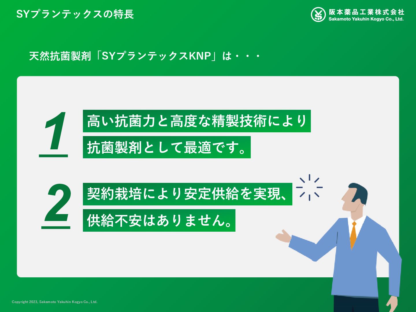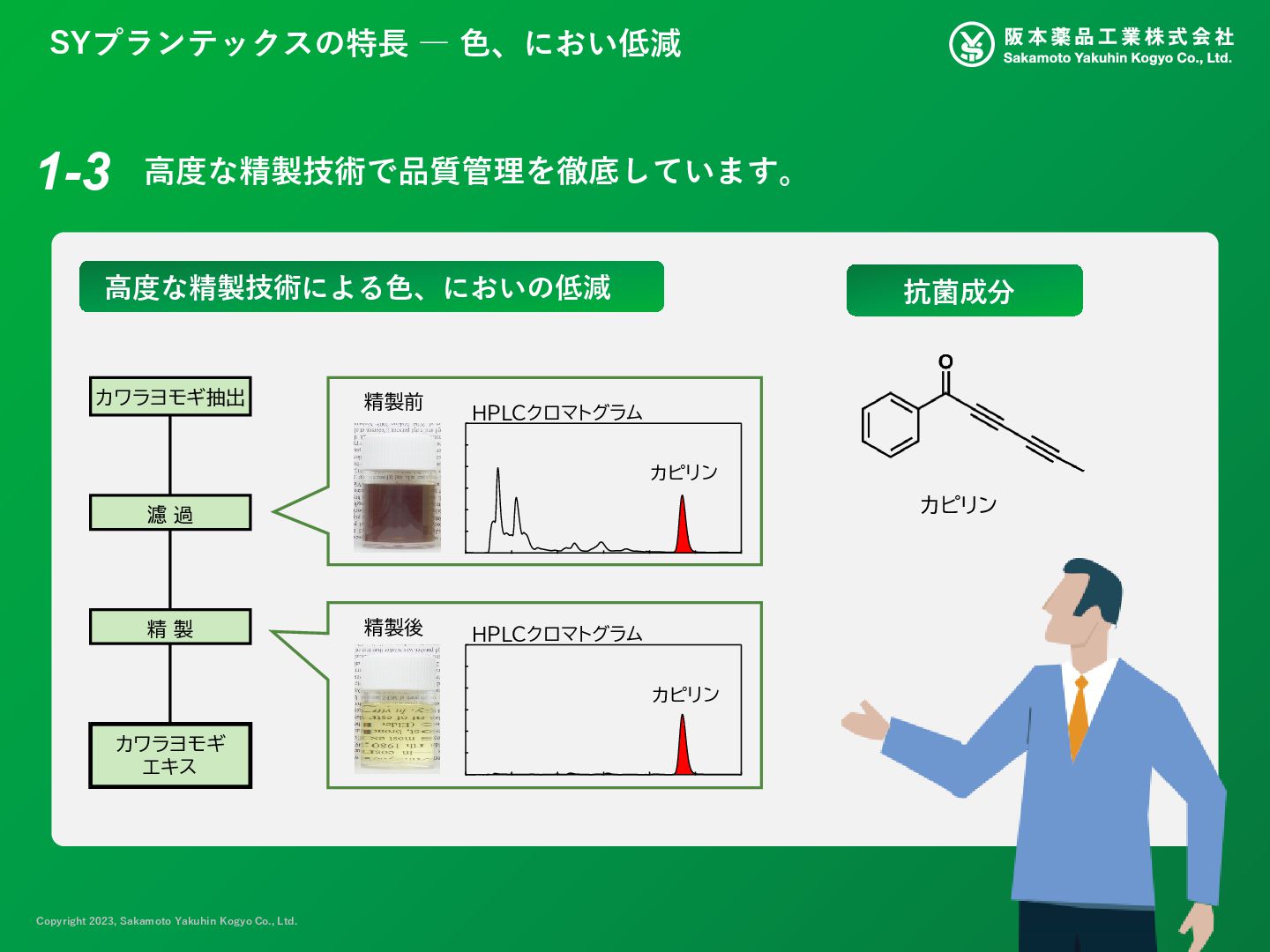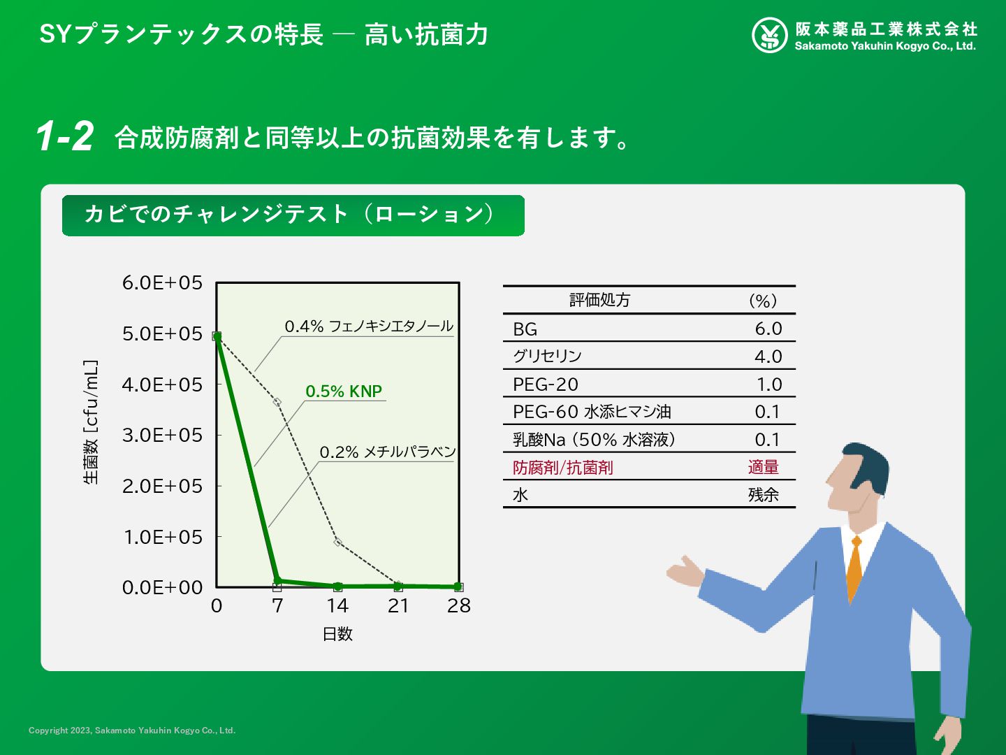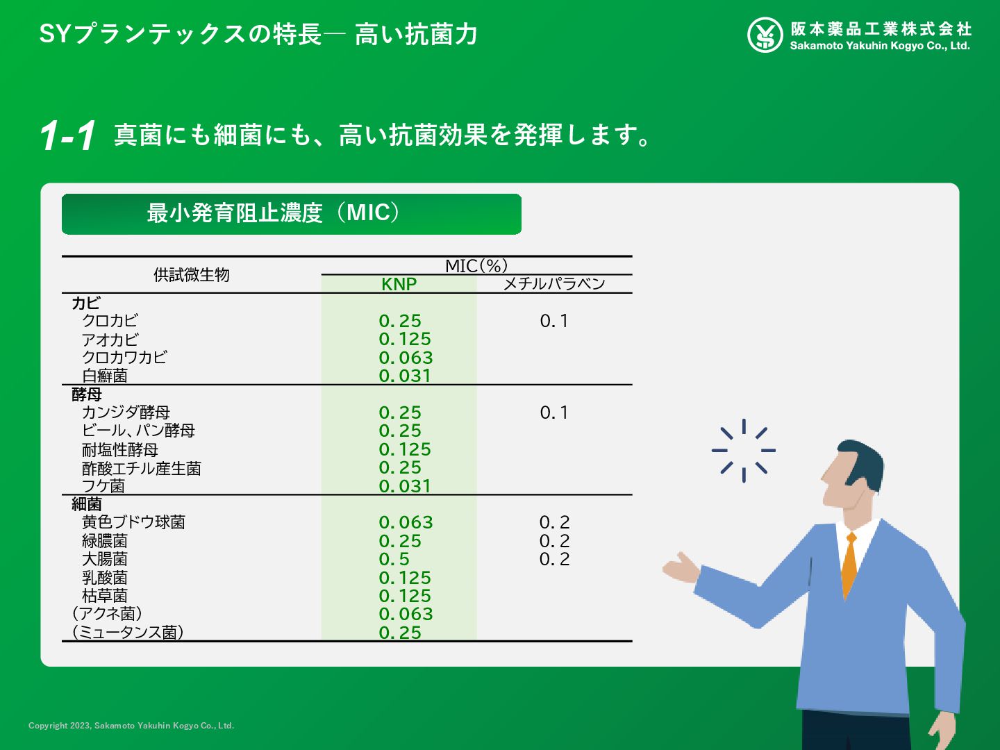 表示名称 INCI名 中文名称 SYプランテックス KNP チョウジエキス EUGENIA CARYOPHYLLUS (CLOVE) FLOWER EXTRACT 丁香(EUGENIA CARYOPHYLLUS) 花提取物 カワラヨモギ花エキス ARTEMISIA CAPILLARIS FLOWER EXTRACT 茵陈蒿(ARTEMISIA CAPILLARIS) 花提取物 カプリル酸グリセリル GLYCERYL CAPRYLATE 甘油辛酸酯 BG BUTYLENE GLYCOL 丁二醇 水 WATER 水 自然由来指数: 1.0 COSMOS認証