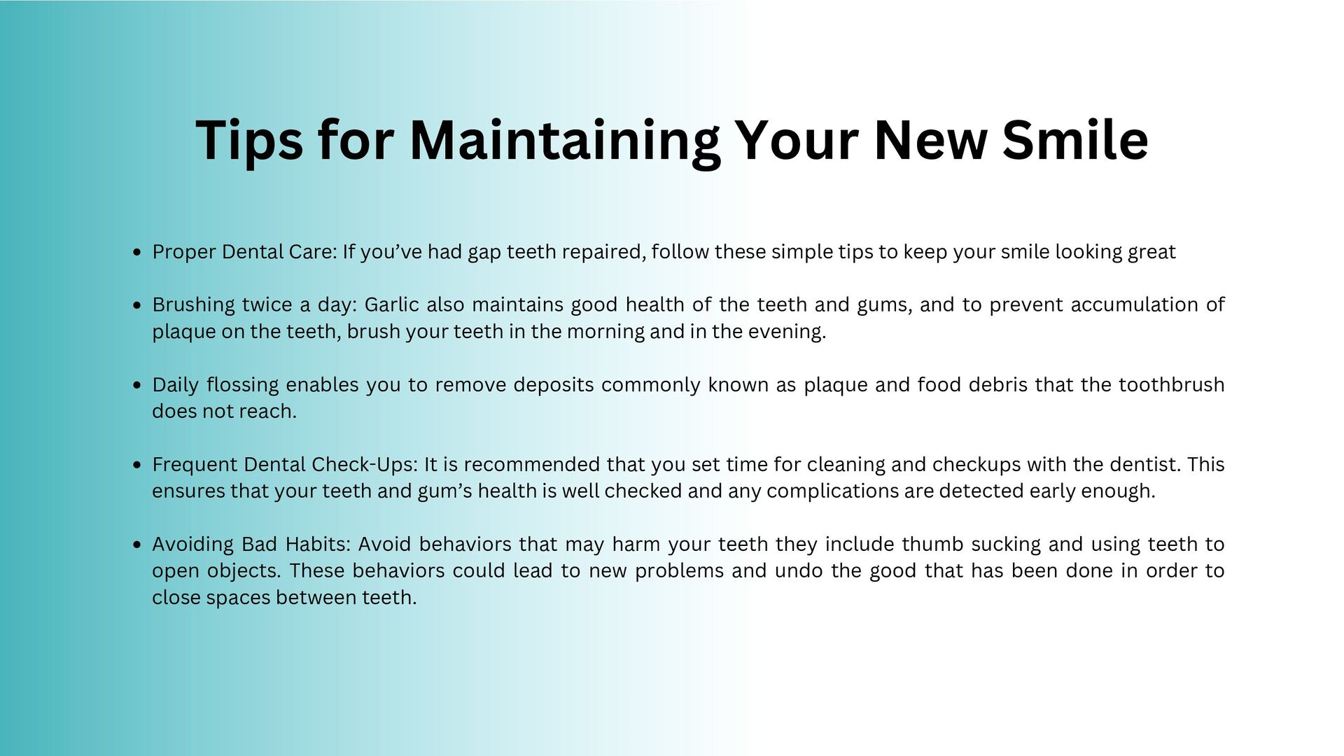 you’ve had gap teeth repaired, follow these simple tips to keep your smile looking great Brushing twice a day: Garlic also maintains good health of the teeth and gums, and to prevent accumulation of plaque on the teeth, brush your teeth in the morning and in the evening. Daily flossing enables you to remove deposits commonly known as plaque and food debris that the toothbrush does not reach. Frequent Dental Check-Ups: It is recommended that you set time for cleaning and checkups with the dentist. This ensures that your teeth and gum’s health is well checked and any complications are detected early enough. Avoiding Bad Habits: Avoid behaviors that may harm your teeth they include thumb sucking and using teeth to open objects. These behaviors could lead to new problems and undo the good that has been done in order to close spaces between teeth.