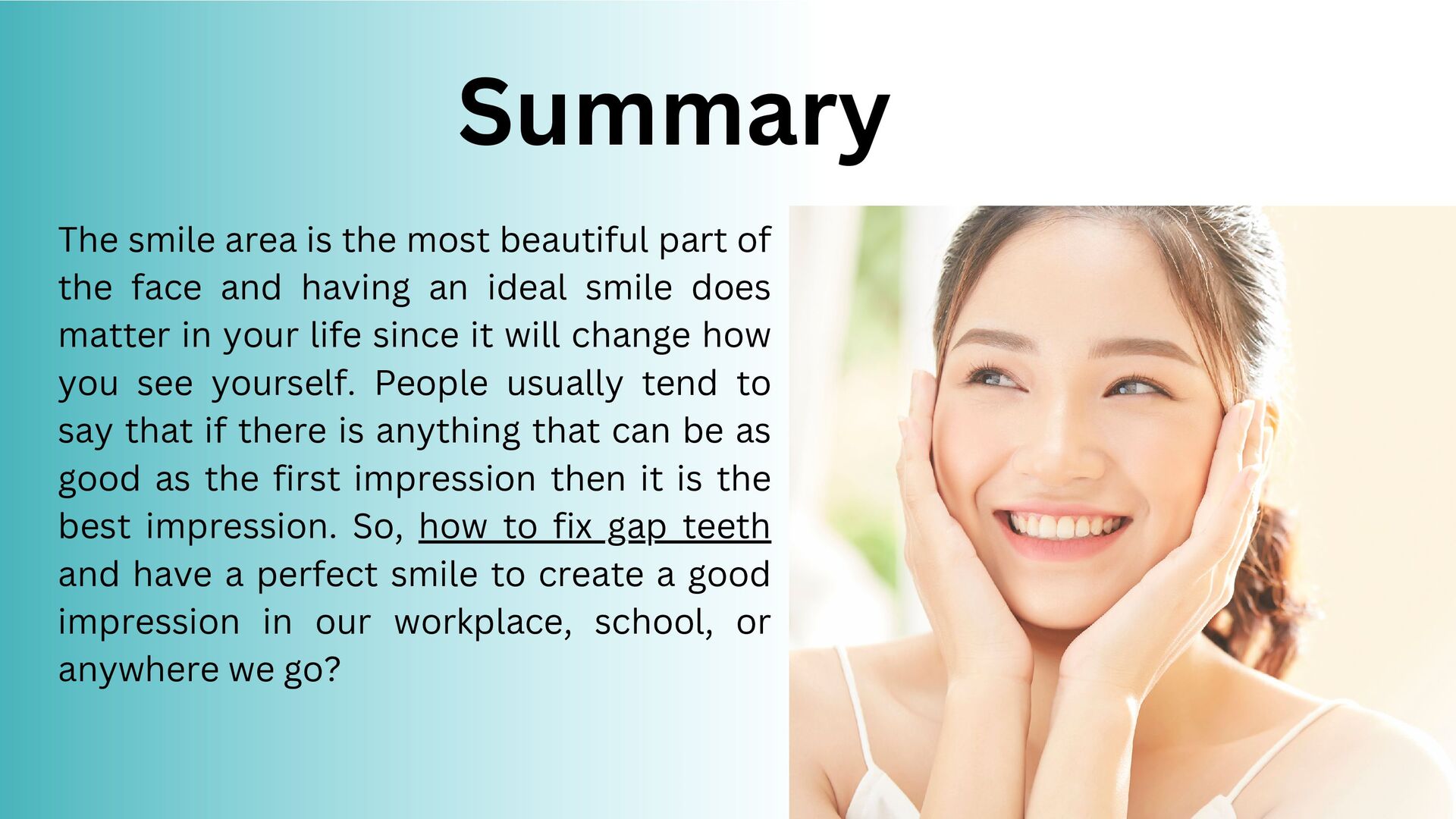 face and having an ideal smile does matter in your life since it will change how you see yourself. People usually tend to say that if there is anything that can be as good as the first impression then it is the best impression. So, how to fix gap teeth and have a perfect smile to create a good impression in our workplace, school, or anywhere we go? Summary