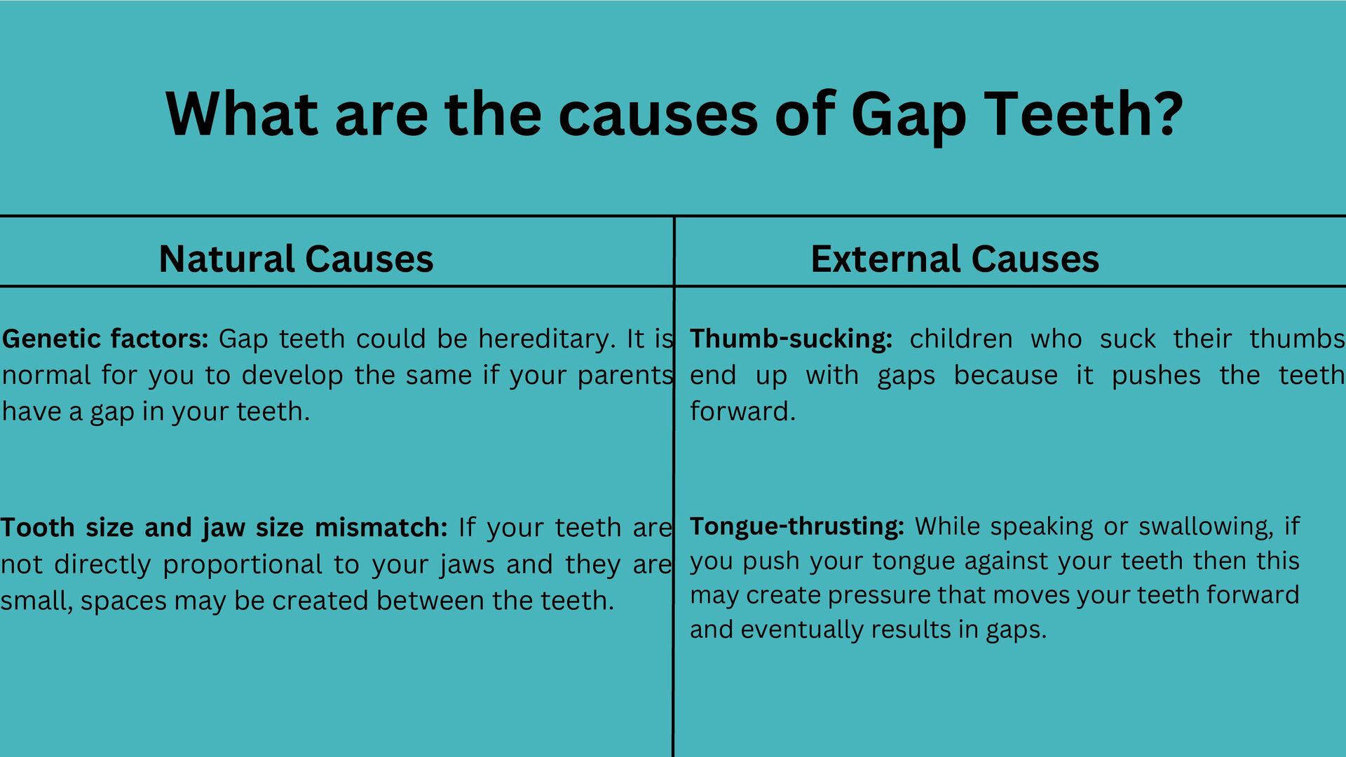Causes Genetic factors: Gap teeth could be hereditary. It is normal for you to develop the same if your parents have a gap in your teeth. Tooth size and jaw size mismatch: If your teeth are not directly proportional to your jaws and they are small, spaces may be created between the teeth. Thumb-sucking: children who suck their thumbs end up with gaps because it pushes the teeth forward. Tongue-thrusting: While speaking or swallowing, if you push your tongue against your teeth then this may create pressure that moves your teeth forward and eventually results in gaps.