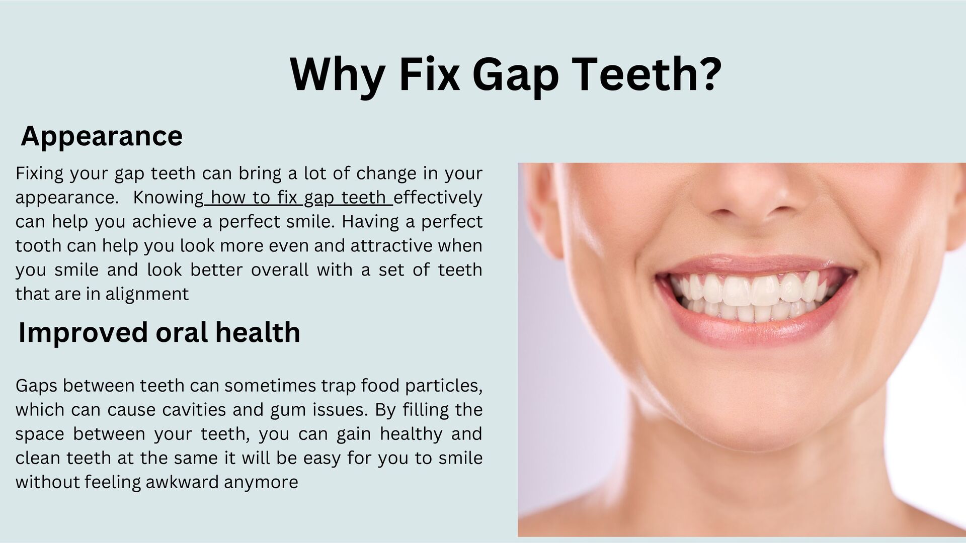 a lot of change in your appearance. Knowing how to fix gap teeth effectively can help you achieve a perfect smile. Having a perfect tooth can help you look more even and attractive when you smile and look better overall with a set of teeth that are in alignment Appearance Improved oral health Gaps between teeth can sometimes trap food particles, which can cause cavities and gum issues. By filling the space between your teeth, you can gain healthy and clean teeth at the same it will be easy for you to smile without feeling awkward anymore