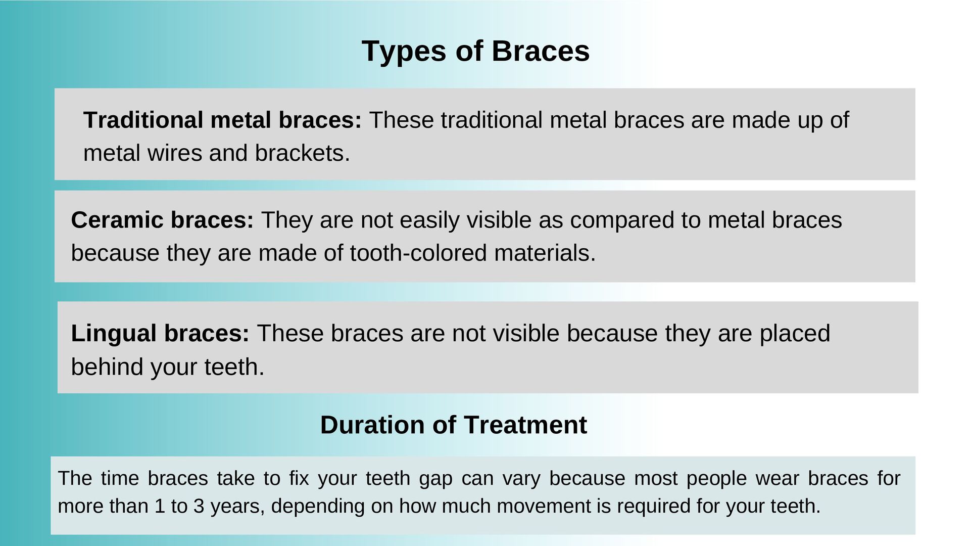audience a better understanding about what you are trying to say. Types of Braces Traditional metal braces: These traditional metal braces are made up of metal wires and brackets. Ceramic braces: They are not easily visible as compared to metal braces because they are made of tooth-colored materials. Lingual braces: These braces are not visible because they are placed behind your teeth. Duration of Treatment The time braces take to fix your teeth gap can vary because most people wear braces for more than 1 to 3 years, depending on how much movement is required for your teeth.