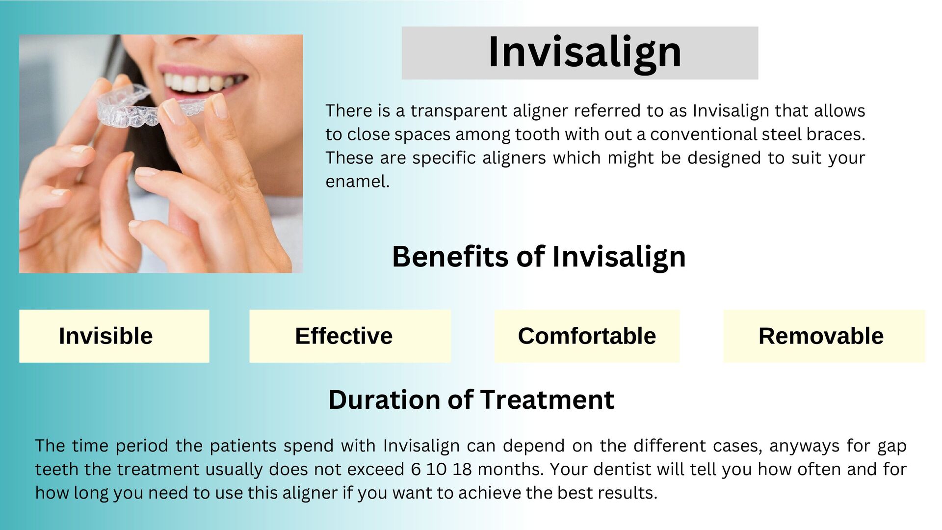 allows to close spaces among tooth with out a conventional steel braces. These are specific aligners which might be designed to suit your enamel. Benefits of Invisalign Invisible Comfortable Removable Effective Duration of Treatment The time period the patients spend with Invisalign can depend on the different cases, anyways for gap teeth the treatment usually does not exceed 6 10 18 months. Your dentist will tell you how often and for how long you need to use this aligner if you want to achieve the best results. Invisalign
