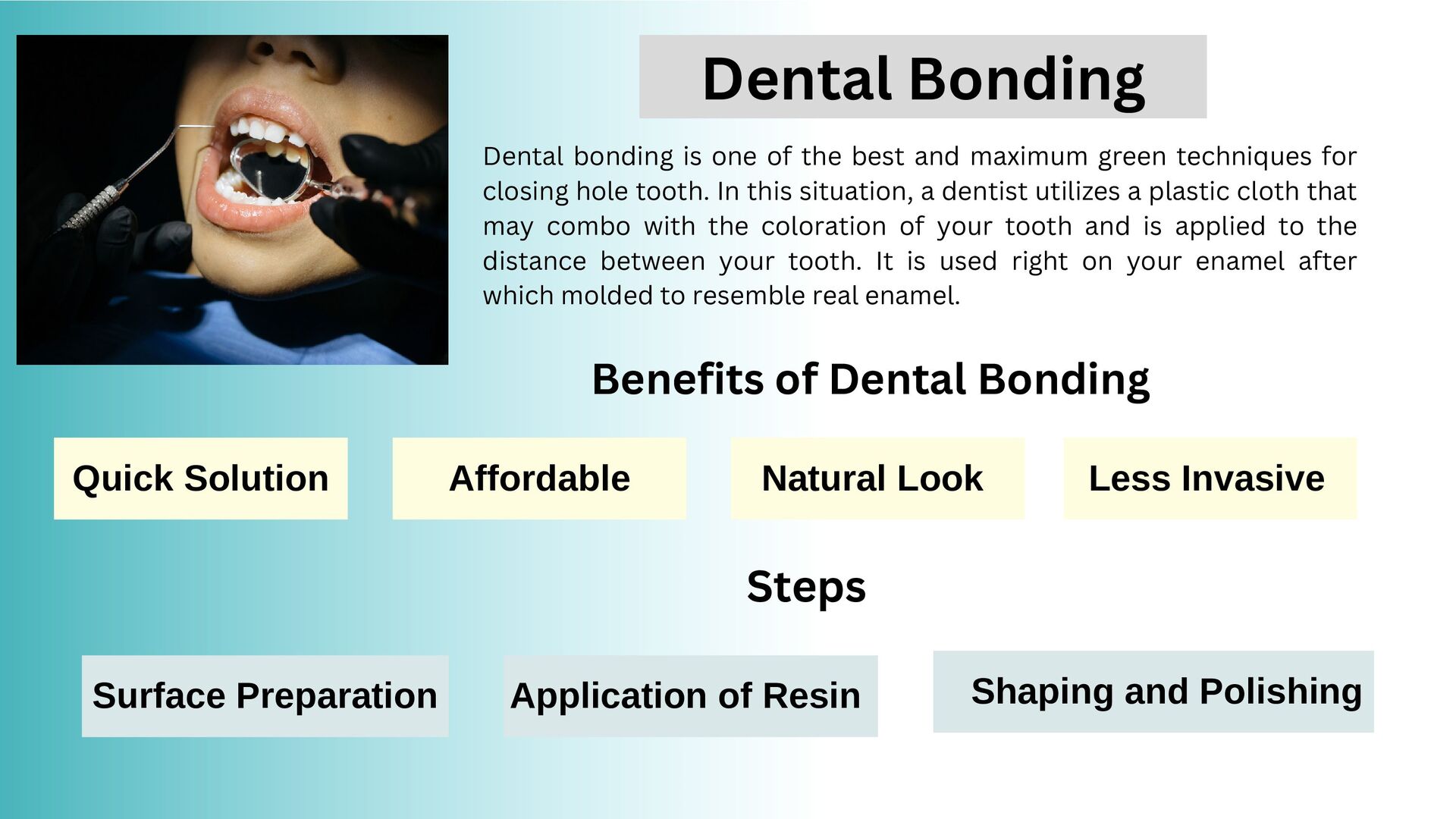 techniques for closing hole tooth. In this situation, a dentist utilizes a plastic cloth that may combo with the coloration of your tooth and is applied to the distance between your tooth. It is used right on your enamel after which molded to resemble real enamel. Benefits of Dental Bonding Quick Solution Affordable Natural Look Less Invasive Steps Surface Preparation Application of Resin Shaping and Polishing Dental Bonding