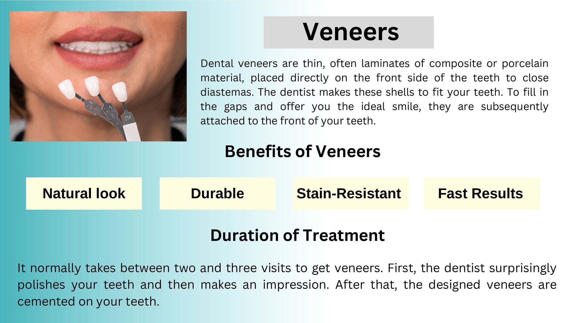 material, placed directly on the front side of the teeth to close diastemas. The dentist makes these shells to fit your teeth. To fill in the gaps and offer you the ideal smile, they are subsequently attached to the front of your teeth. Benefits of Veneers Natural look Durable Stain-Resistant Fast Results Duration of Treatment It normally takes between two and three visits to get veneers. First, the dentist surprisingly polishes your teeth and then makes an impression. After that, the designed veneers are cemented on your teeth. Veneers