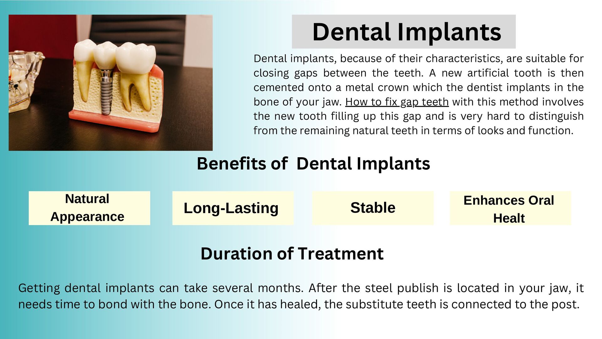 gaps between the teeth. A new artificial tooth is then cemented onto a metal crown which the dentist implants in the bone of your jaw. How to fix gap teeth with this method involves the new tooth filling up this gap and is very hard to distinguish from the remaining natural teeth in terms of looks and function. Benefits of Dental Implants Duration of Treatment Getting dental implants can take several months. After the steel publish is located in your jaw, it needs time to bond with the bone. Once it has healed, the substitute teeth is connected to the post. Natural Appearance Stable Enhances Oral Healt Long-Lasting Dental Implants