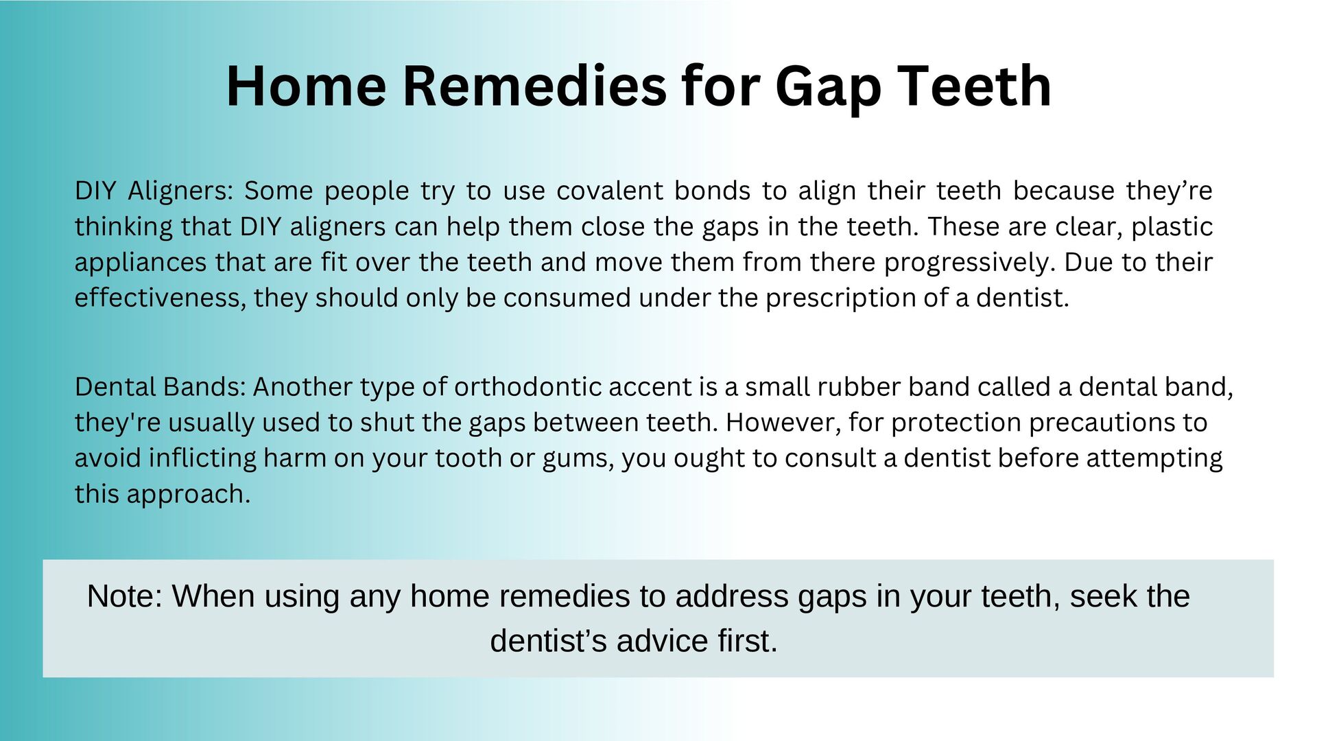 to use covalent bonds to align their teeth because they’re thinking that DIY aligners can help them close the gaps in the teeth. These are clear, plastic appliances that are fit over the teeth and move them from there progressively. Due to their effectiveness, they should only be consumed under the prescription of a dentist. Dental Bands: Another type of orthodontic accent is a small rubber band called a dental band, they're usually used to shut the gaps between teeth. However, for protection precautions to avoid inflicting harm on your tooth or gums, you ought to consult a dentist before attempting this approach. Note: When using any home remedies to address gaps in your teeth, seek the dentist’s advice first.