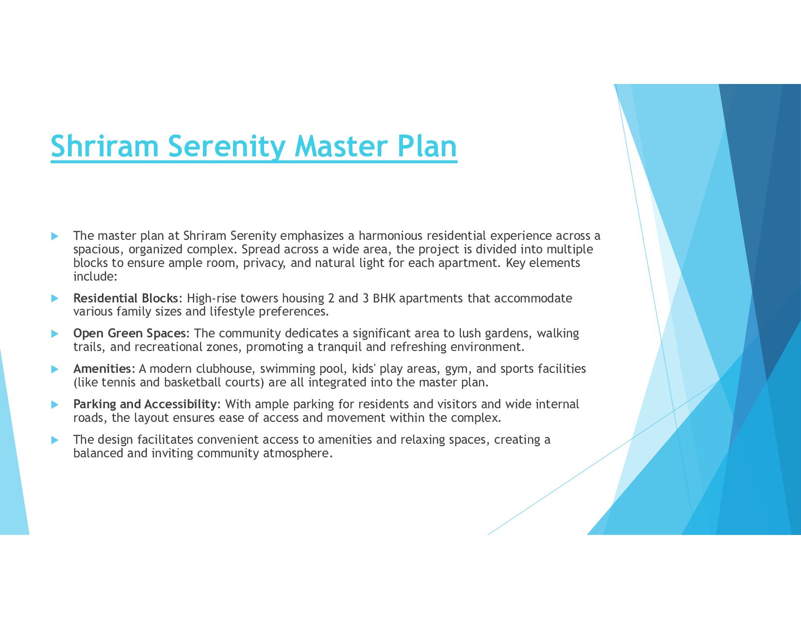 The master plan at Shriram Serenity emphasizes a harmonious residential experience across a spacious, organized complex. Spread across a wide area, the project is divided into multiple blocks to ensure ample room, privacy, and natural light for each apartment. Key elements include: