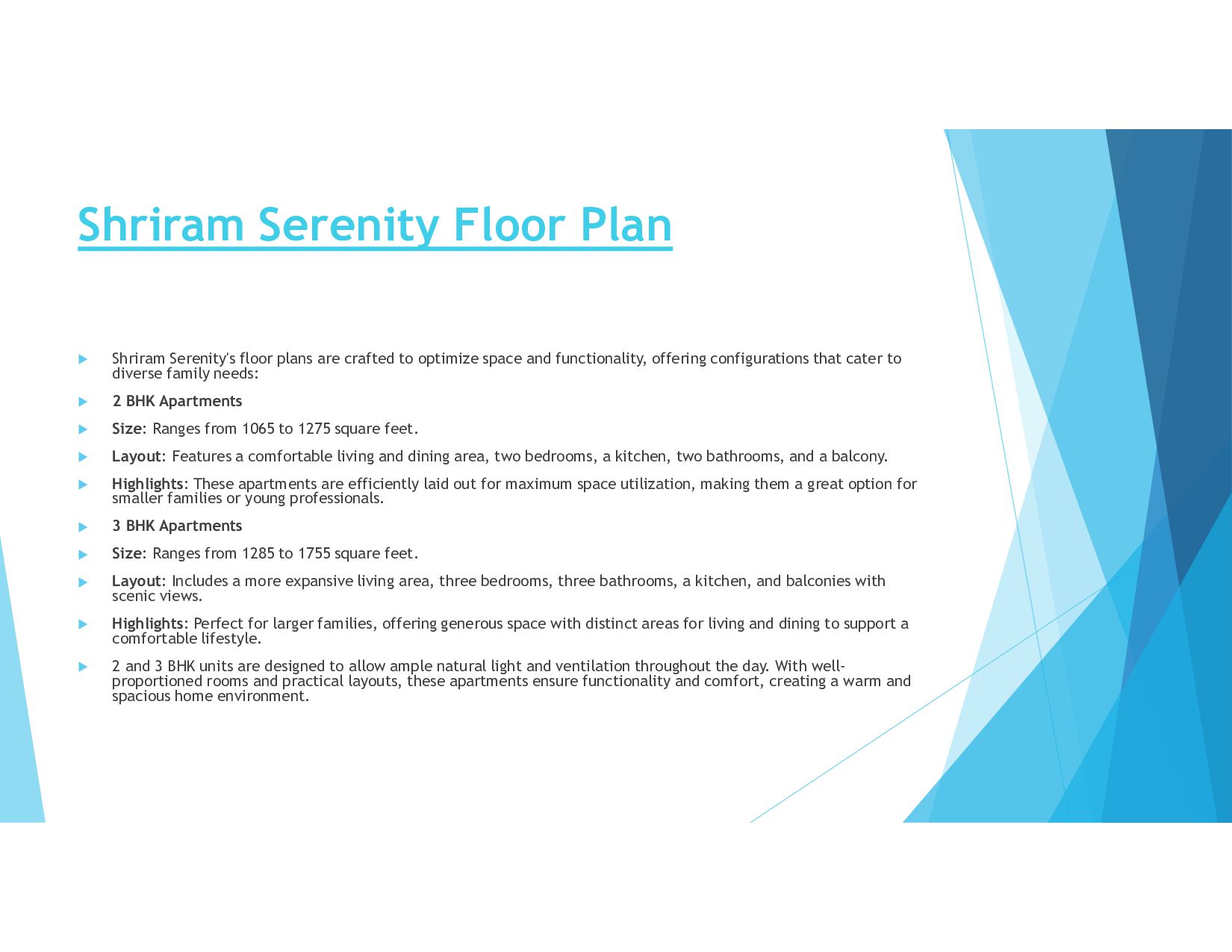 Shriram Serenity's floor plans are crafted to optimize space and functionality, offering configurations that cater to diverse family needs: