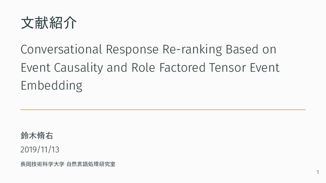Nakamura. Conversational Response Re-ranking Based on Event Causality and Role Factored Tensor Event Embedding. In Proceedings of the First Workshop on NLP for Conversational AI, pages 51–59, Florence, Italy, August 2019. Association for Computational Linguistics. 2