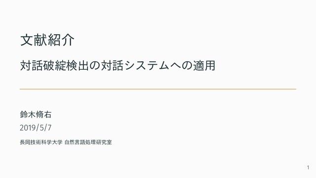 文献紹介 対話破綻検出の対話システムへの適用 鈴木脩右 2019/5/7 長岡技術科学大学 自然言語処理研究室 1