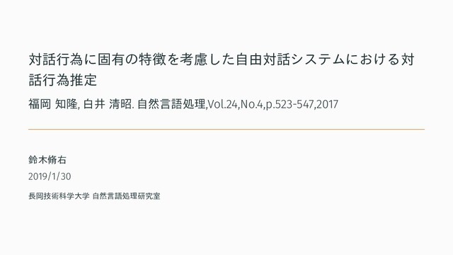 文献情報 対話行為に固有の特徴を考慮した自由対話システムにおける対話行為推定 福岡 知隆 , 白井 清昭 自然言語処理 ,Vol.24,No.4,p.523-547,2017