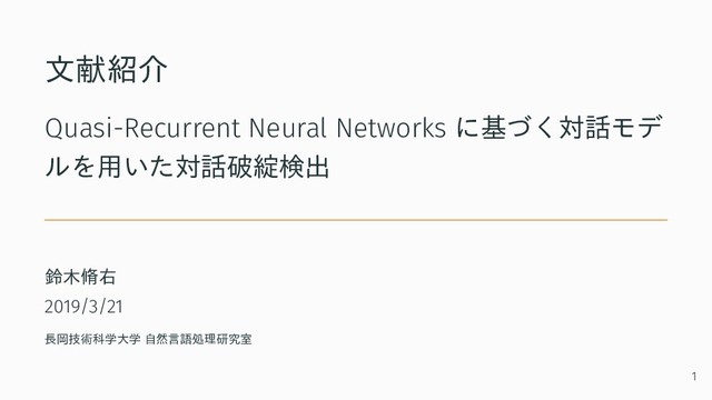 文献紹介 Quasi-Recurrent Neural Networks に基づく対話モデ ルを用いた対話破綻検出 鈴木脩右 2019/3/21 長岡技術科学大学 自然言語処理研究室
