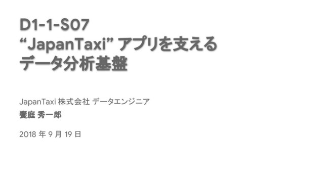 D1-1-S07 “JapanTaxi” アプリを支える データ分析基盤 饗庭 秀一郎 JapanTaxi 株式会社 データエンジニア 饗庭