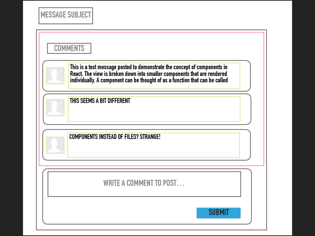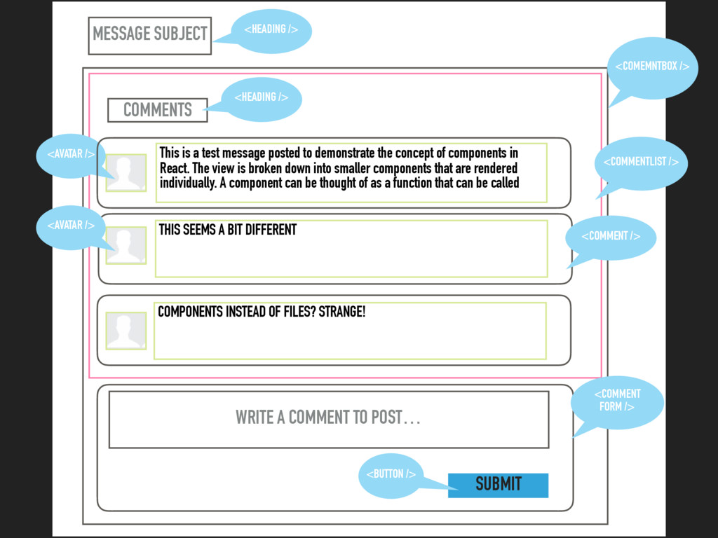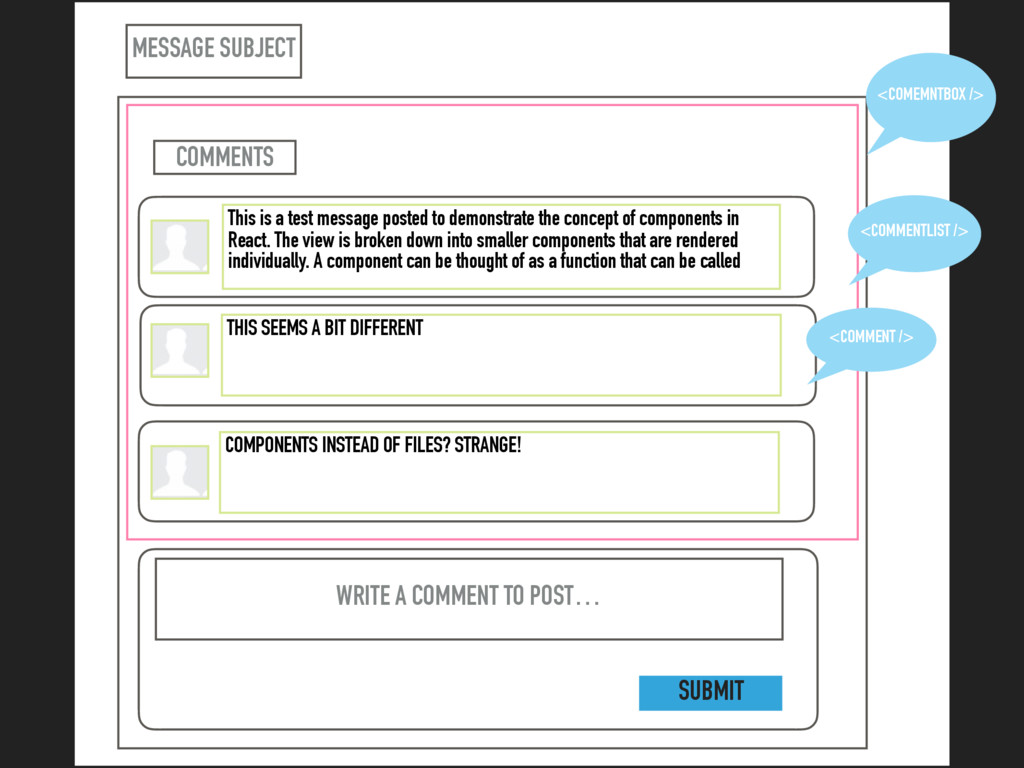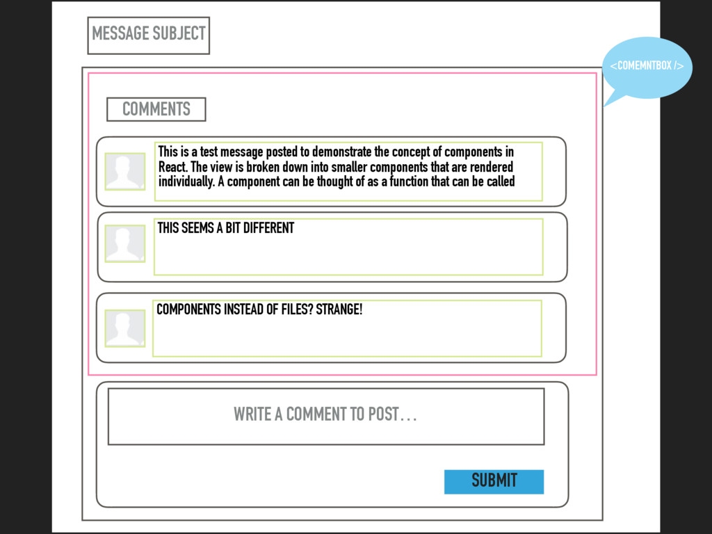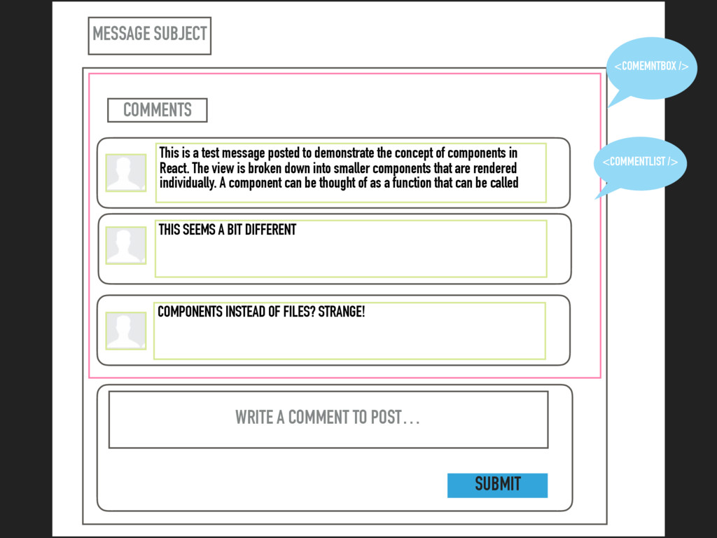 the concept of components in React. The view is broken down into smaller components that are rendered individually. A component can be thought of as a function that can be called THIS SEEMS A BIT DIFFERENT WRITE A COMMENT TO POST… COMPONENTS INSTEAD OF FILES? STRANGE! COMMENTS <COMEMNTBOX /> SUBMIT