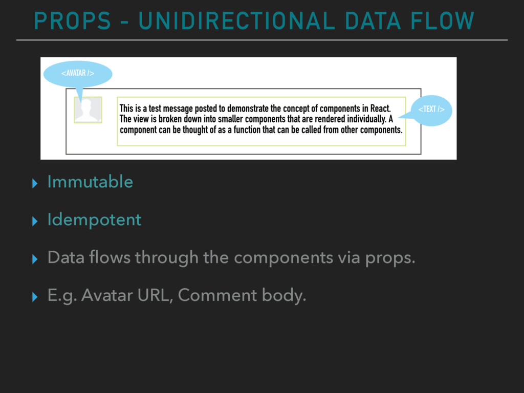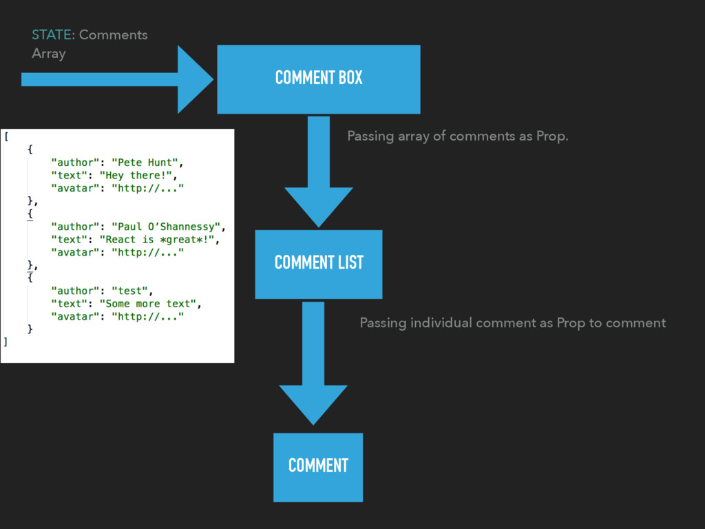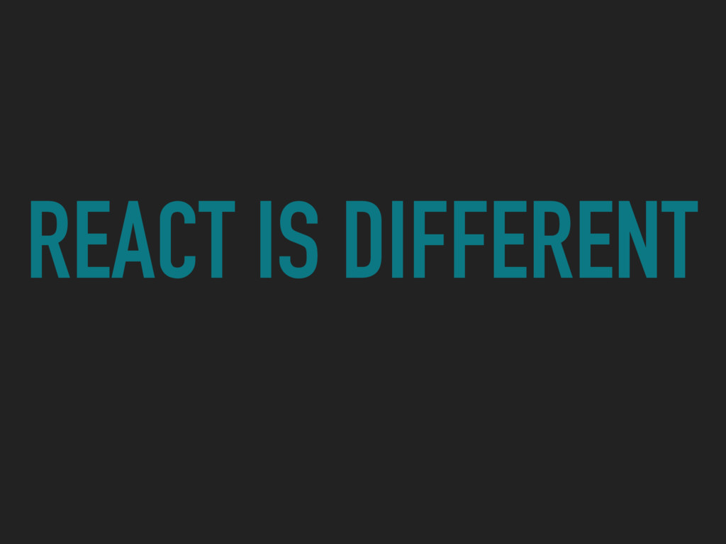the concept of components in React. The view is broken down into smaller components that are rendered individually. A component can be thought of as a function that can be called THIS SEEMS A BIT DIFFERENT WRITE A COMMENT TO POST… COMPONENTS INSTEAD OF FILES? STRANGE! COMMENTS <COMEMNTBOX /> <AVATAR /> <COMMENTLIST /> <COMMENT /> <AVATAR /> SUBMIT <BUTTON /> <COMMENT FORM /> <HEADING /> <HEADING />
