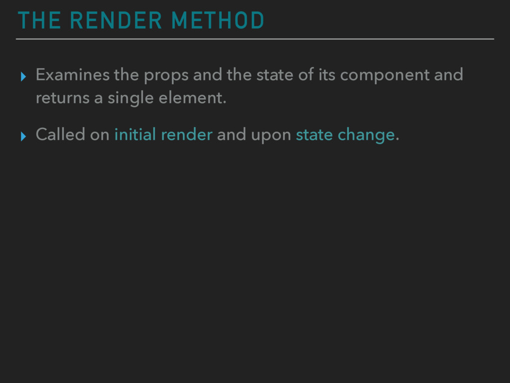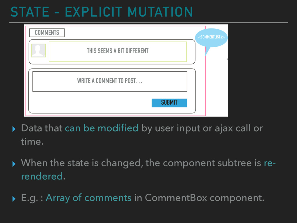 by user input or ajax call or time. ▸ When the state is changed, the component subtree is re- rendered. ▸ E.g. : Array of comments in CommentBox component.