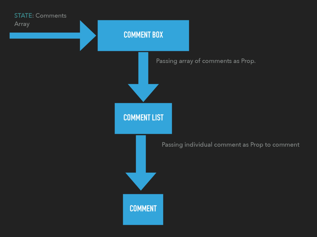 the concept of components in React. The view is broken down into smaller components that are rendered individually. A component can be thought of as a function that can be called THIS SEEMS A BIT DIFFERENT WRITE A COMMENT TO POST… COMPONENTS INSTEAD OF FILES? STRANGE! COMMENTS <COMEMNTBOX /> <COMMENTLIST /> <COMMENT /> SUBMIT