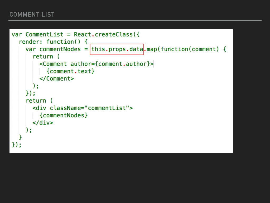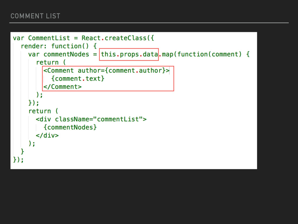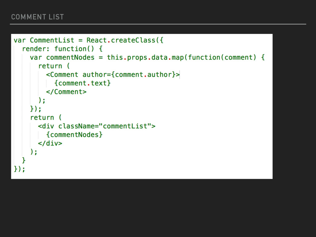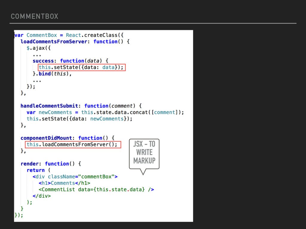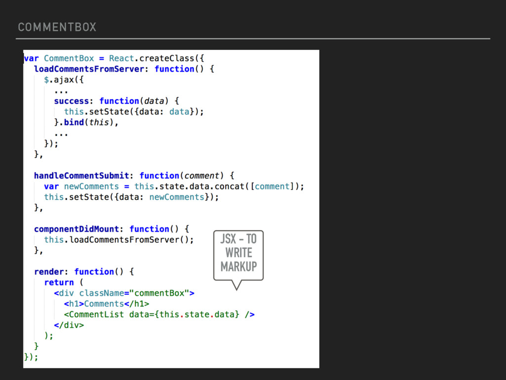 the concept of components in React. The view is broken down into smaller components that are rendered individually. A component can be thought of as a function that can be called THIS SEEMS A BIT DIFFERENT WRITE A COMMENT TO POST… COMPONENTS INSTEAD OF FILES? STRANGE! COMMENTS <COMEMNTBOX /> <COMMENTLIST /> SUBMIT
