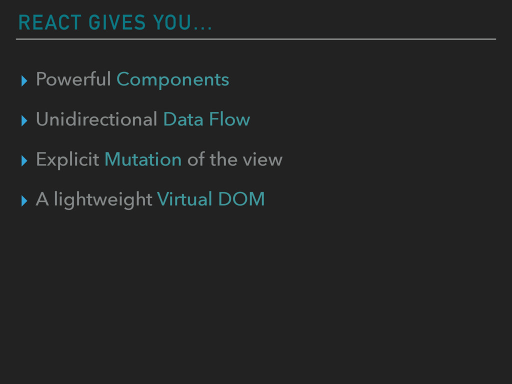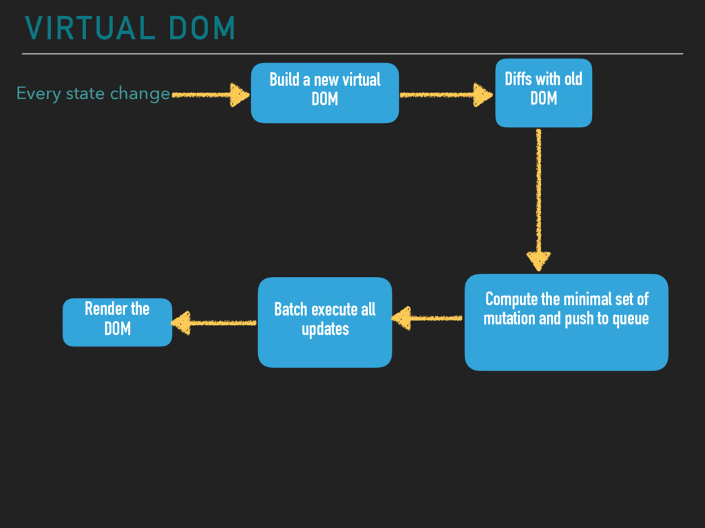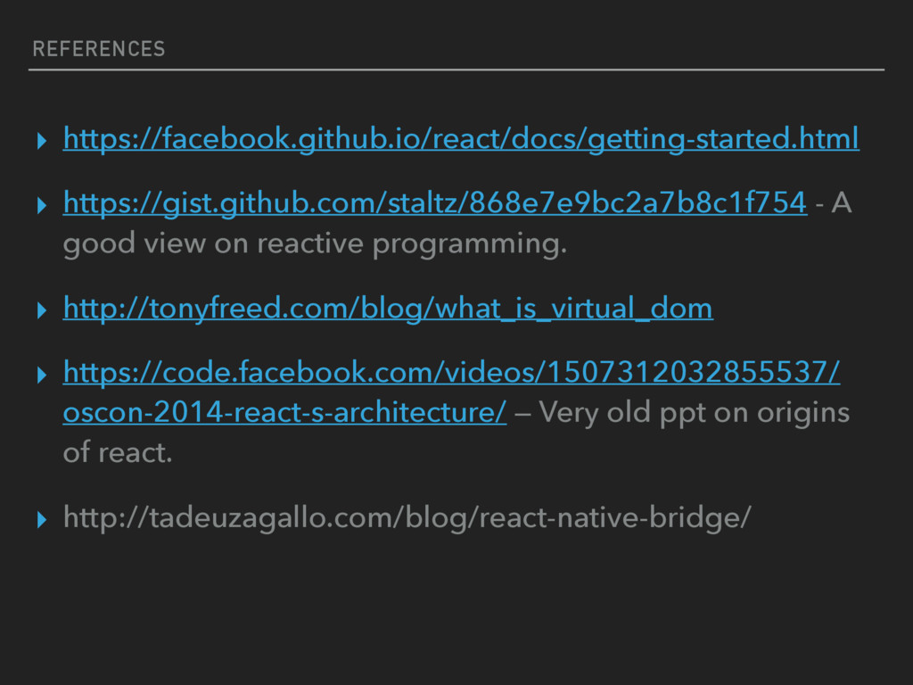 reactive programming. ▸ http://tonyfreed.com/blog/what_is_virtual_dom ▸ https://code.facebook.com/videos/1507312032855537/ oscon-2014-react-s-architecture/ — Very old ppt on origins of react. ▸ http://tadeuzagallo.com/blog/react-native-bridge/
