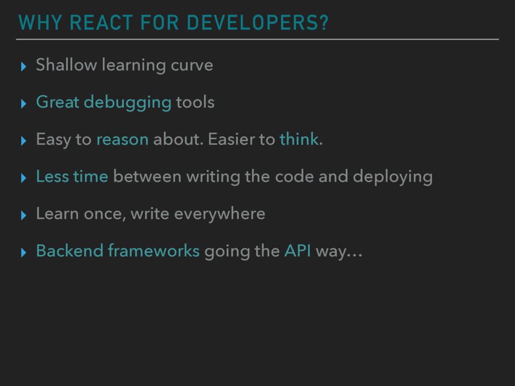 debugging tools ▸ Easy to reason about. Easier to think. ▸ Less time between writing the code and deploying ▸ Learn once, write everywhere ▸ Backend frameworks going the API way…