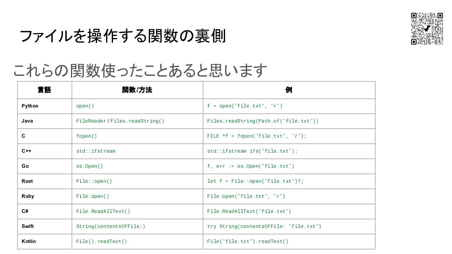"r") Java FileReader / Files.readString() Files.readString(Path.of("file.txt")) C fopen() FILE *f = fopen("file.txt", "r"); C++ std::ifstream std::ifstream ifs("file.txt"); Go os.Open() f, err := os.Open("file.txt") Rust File::open() let f = File::open("file.txt")?; Ruby File.open() File.open("file.txt", "r") C# File.ReadAllText() File.ReadAllText("file.txt") Swift String(contentsOfFile:) try String(contentsOfFile: "file.txt") Kotlin File().readText() File("file.txt").readText()