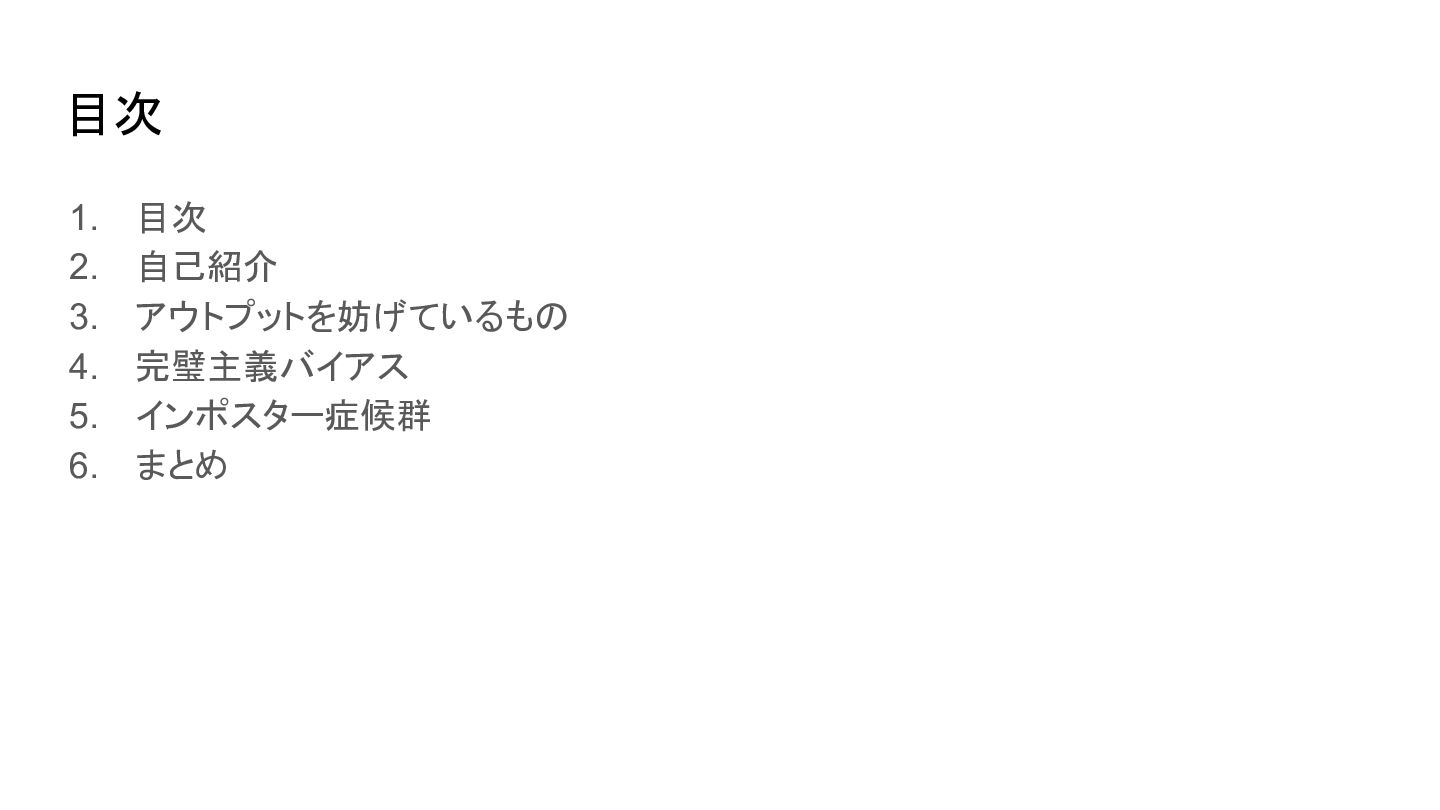 目次 1. 目次 2. 自己紹介 3. アウトプットを妨げているもの 4. 完璧主義バイアス 5.