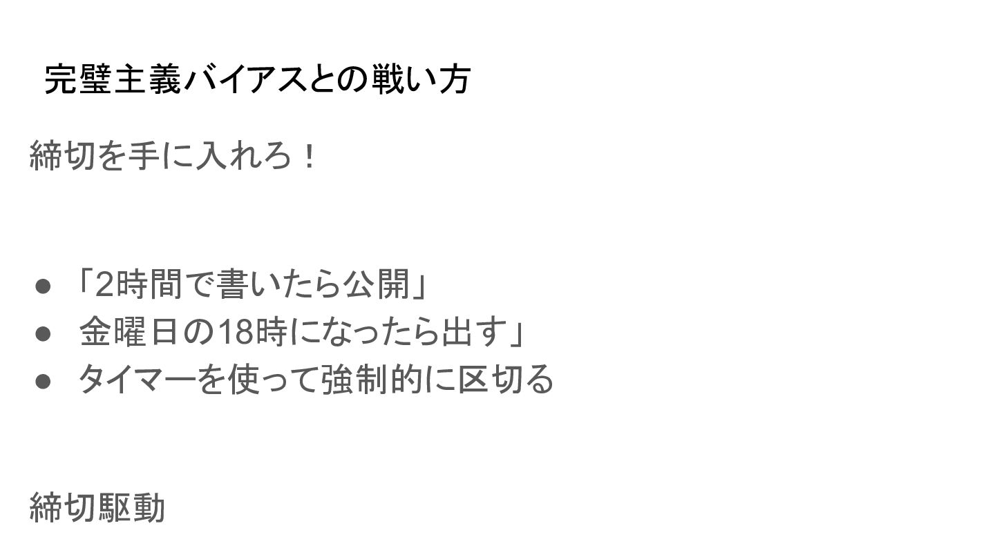 完璧主義バイアスとの戦い方 締切を手に入れろ! • 「2時間で書いたら公開」 • 金曜日の18時になったら出す」 • タイマーを使って強制的に区切る 締切駆動