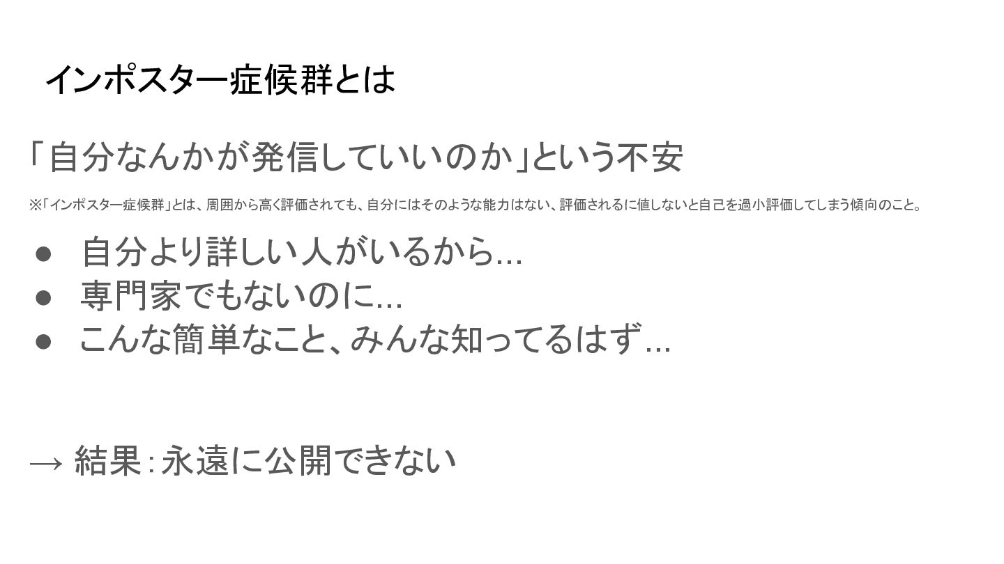 インポスター症候群とは 「自分なんかが発信していいのか」という不安 ※「インポスター症候群」とは、周囲から高く評価されても、自分にはそのような能力はない、評価されるに値しないと自己を過小評価してしまう傾向のこと。 • 自分より詳しい人がいるから... • 専門家でもないのに... • こんな簡単なこと、みんな知ってるはず... →