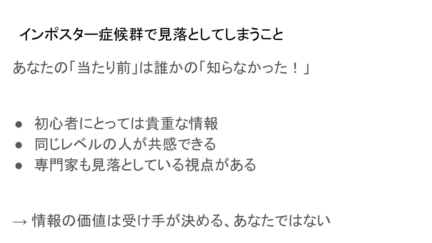 インポスター症候群で見落としてしまうこと あなたの「当たり前」は誰かの「知らなかった!」 • 初心者にとっては貴重な情報 • 同じレベルの人が共感できる • 専門家も見落としている視点がある → 情報の価値は受け手が決める、あなたではない
