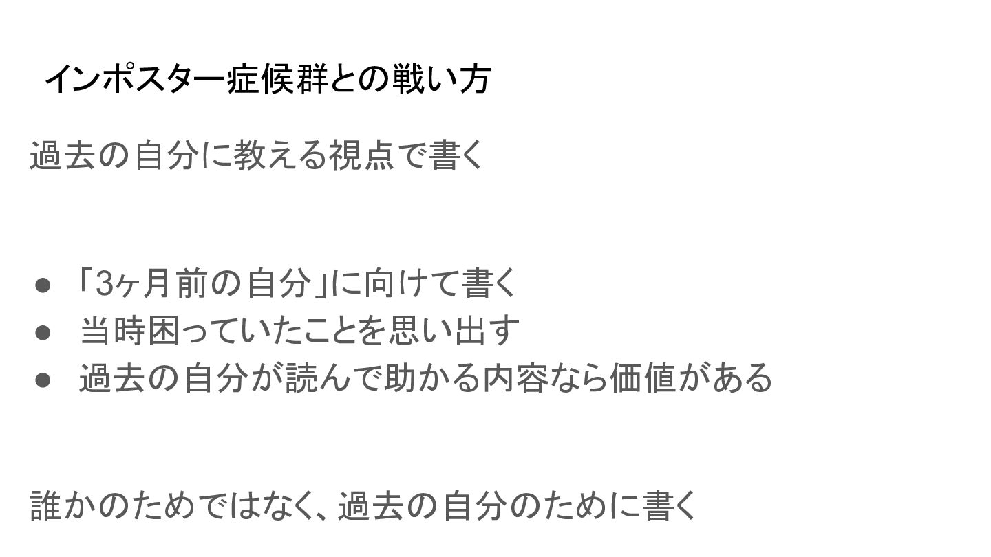 インポスター症候群との戦い方 過去の自分に教える視点で書く • 「3ヶ月前の自分」に向けて書く • 当時困っていたことを思い出す • 過去の自分が読んで助かる内容なら価値がある 誰かのためではなく、過去の自分のために書く