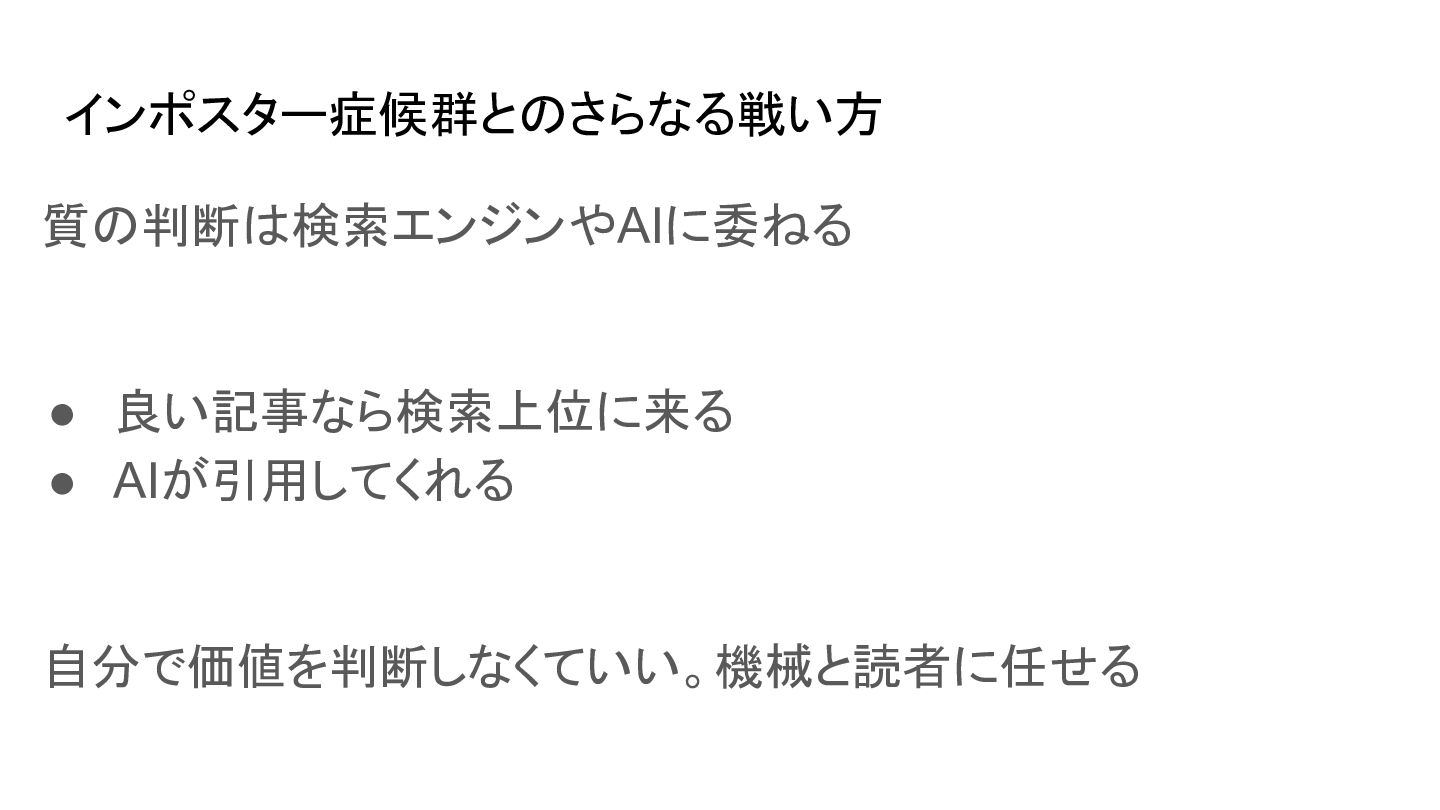 インポスター症候群とのさらなる戦い方 質の判断は検索エンジンやAIに委ねる • 良い記事なら検索上位に来る • AIが引用してくれる 自分で価値を判断しなくていい。機械と読者に任せる