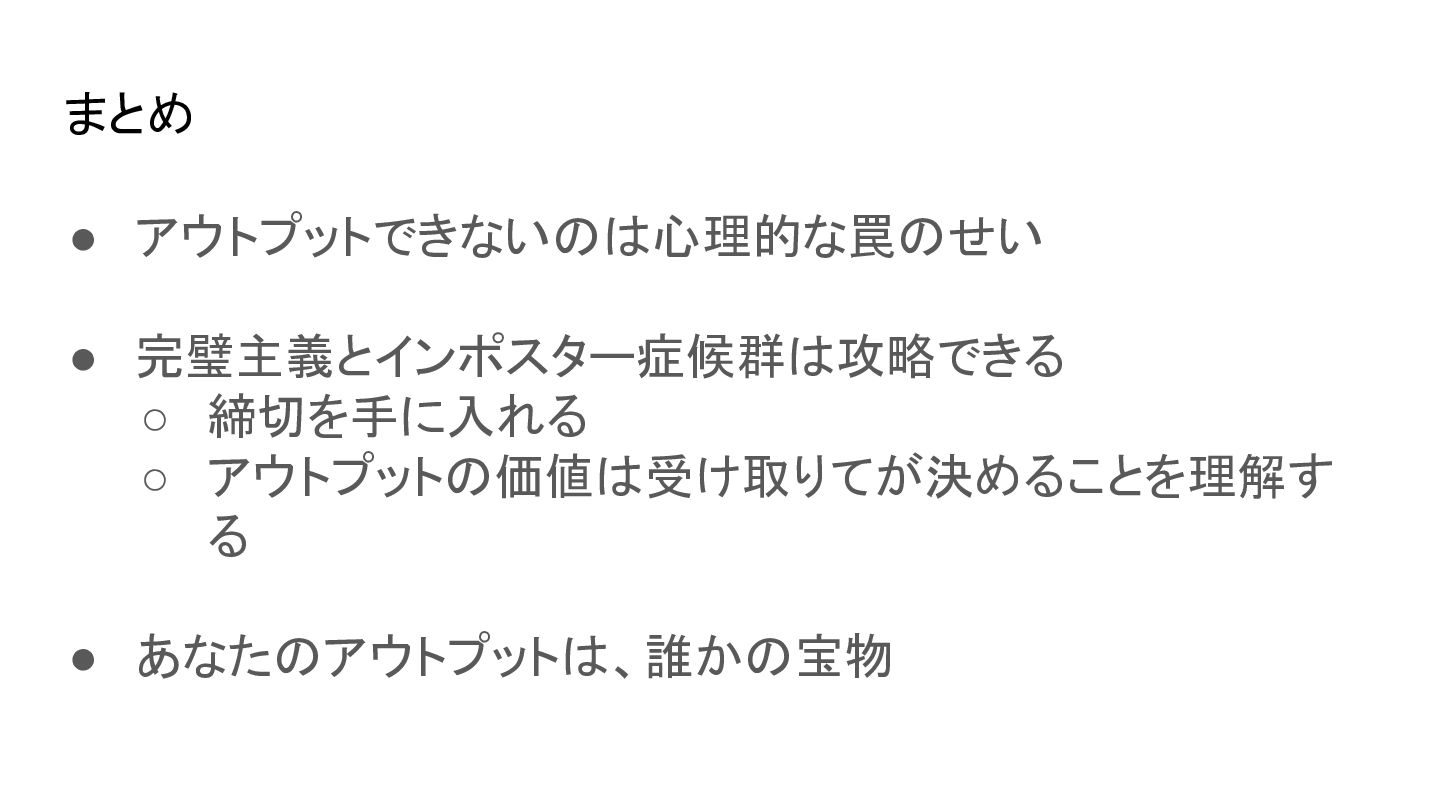 まとめ • アウトプットできないのは心理的な罠のせい • 完璧主義とインポスター症候群は攻略できる ◦ 締切を手に入れる ◦ アウトプットの価値は受け取りてが決めることを理解す る