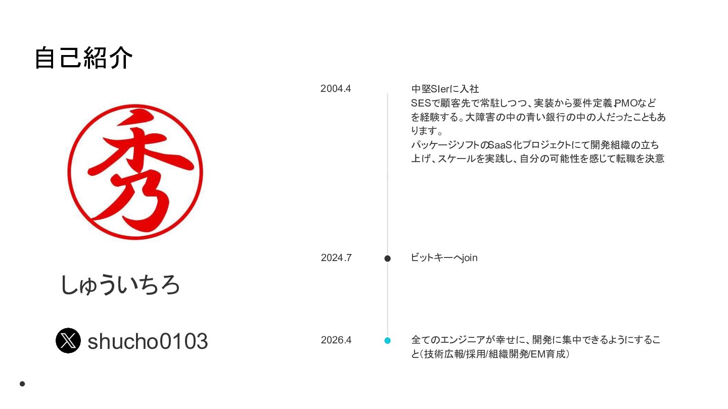 上げ、スケールを実践し、自分の可能性を感じて転職を決意 ビットキーへjoin 2026.4 全てのエンジニアが幸せに、開発に集中できるようにするこ と(技術広報/採用/組織開発/EM育成) shucho0103 •