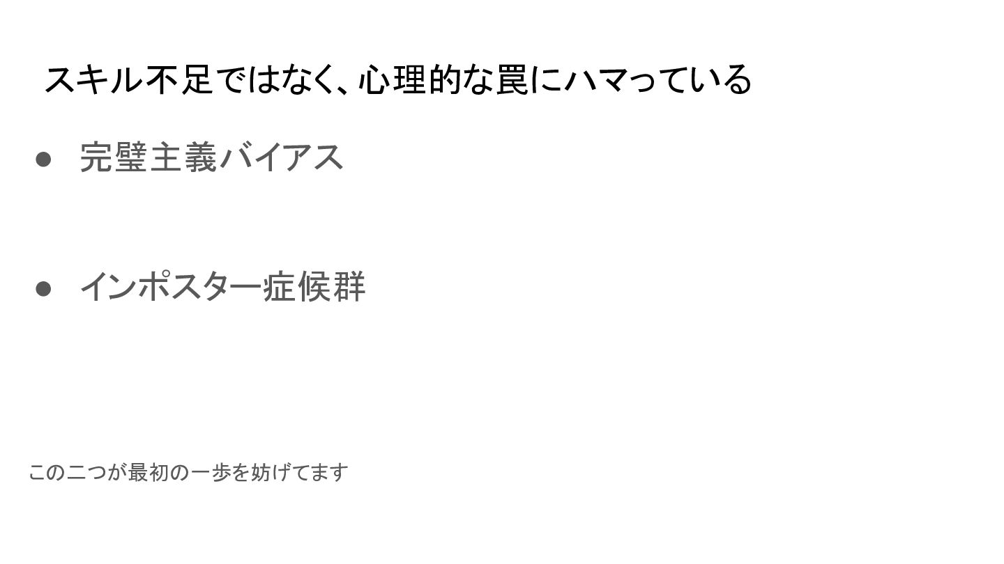 スキル不足ではなく、心理的な罠にハマっている • 完璧主義バイアス • インポスター症候群 この二つが最初の一歩を妨げてます