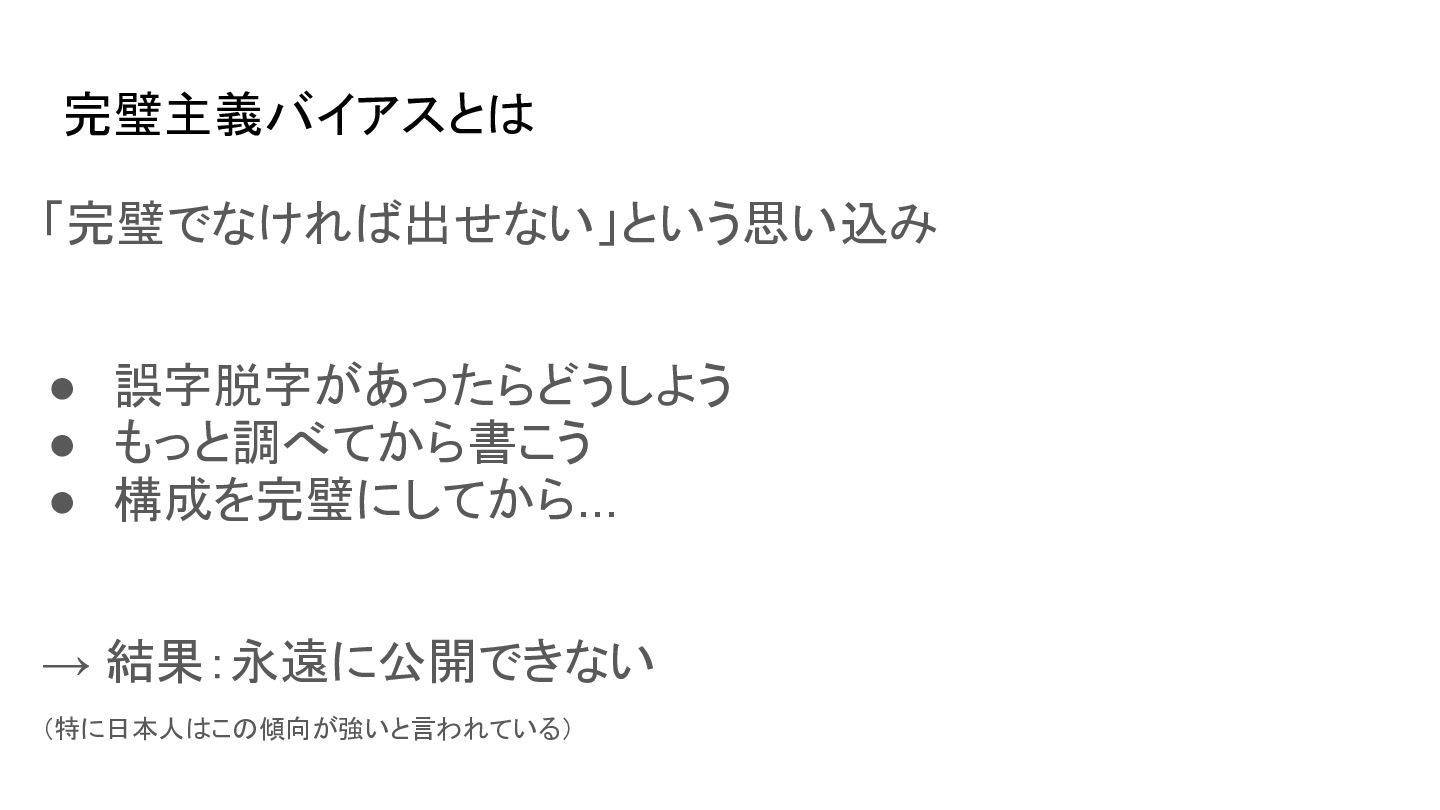 完璧主義バイアスとは 「完璧でなければ出せない」という思い込み • 誤字脱字があったらどうしよう • もっと調べてから書こう • 構成を完璧にしてから... → 結果:永遠に公開できない