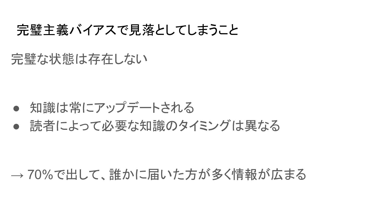 完璧主義バイアスで見落としてしまうこと 完璧な状態は存在しない • 知識は常にアップデートされる • 読者によって必要な知識のタイミングは異なる → 70%で出して、誰かに届いた方が多く情報が広まる