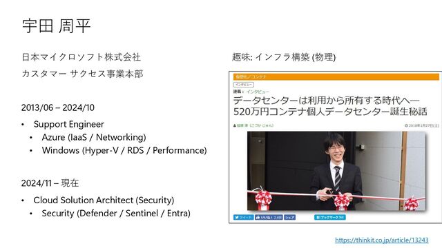 https://thinkit.co.jp/article/13243 宇田 周平 日本マイクロソフト株式会社 カスタマー サクセス事業本部 2013/06 – 2024/10 •