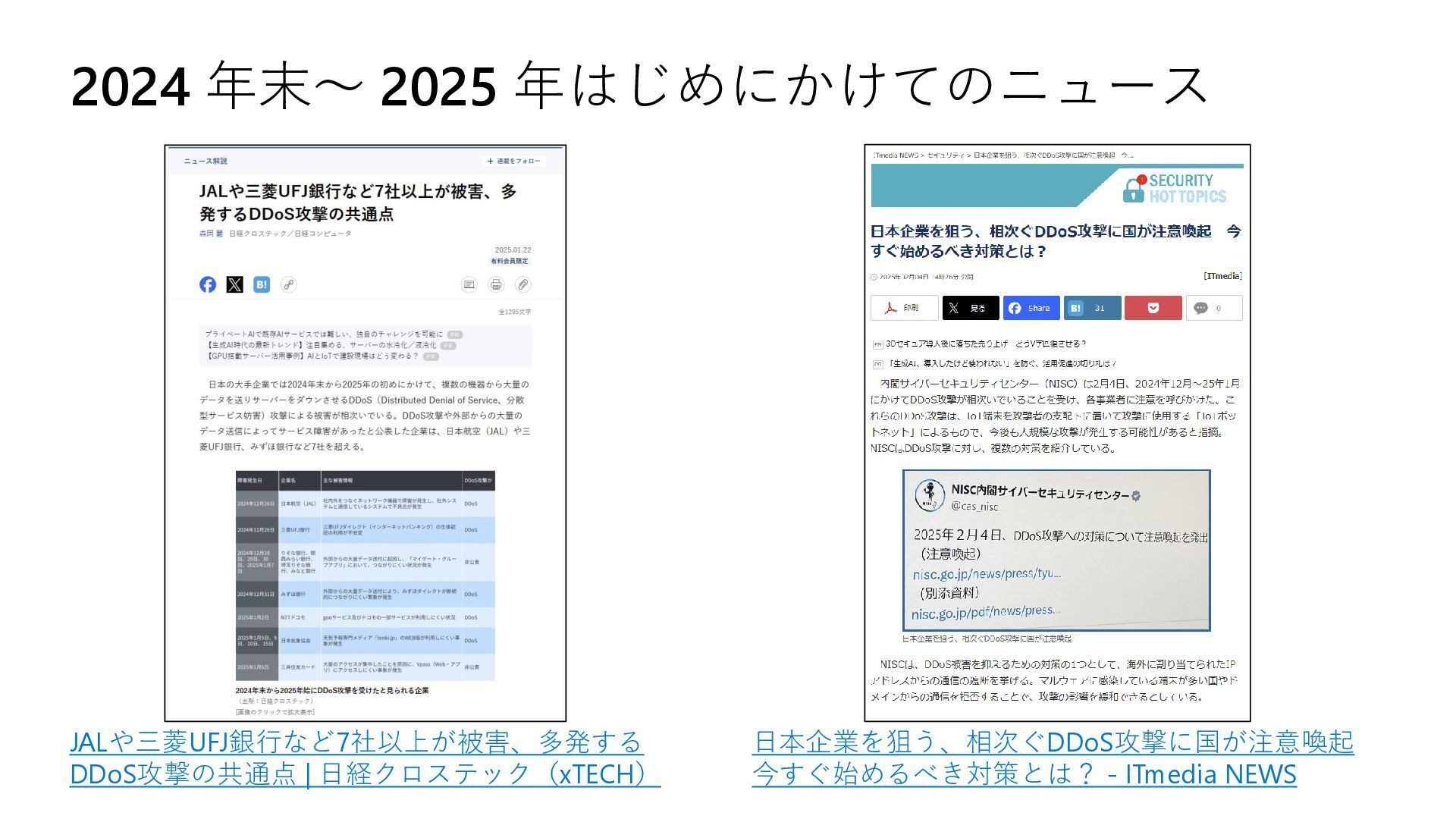 2024 年末~ 2025 年はじめにかけてのニュース 日本企業を狙う、相次ぐDDoS攻撃に国が注意喚起 今すぐ始めるべき対策とは? - ITmedia NEWS JALや三菱UFJ銀行など7社以上が被害、多発する
