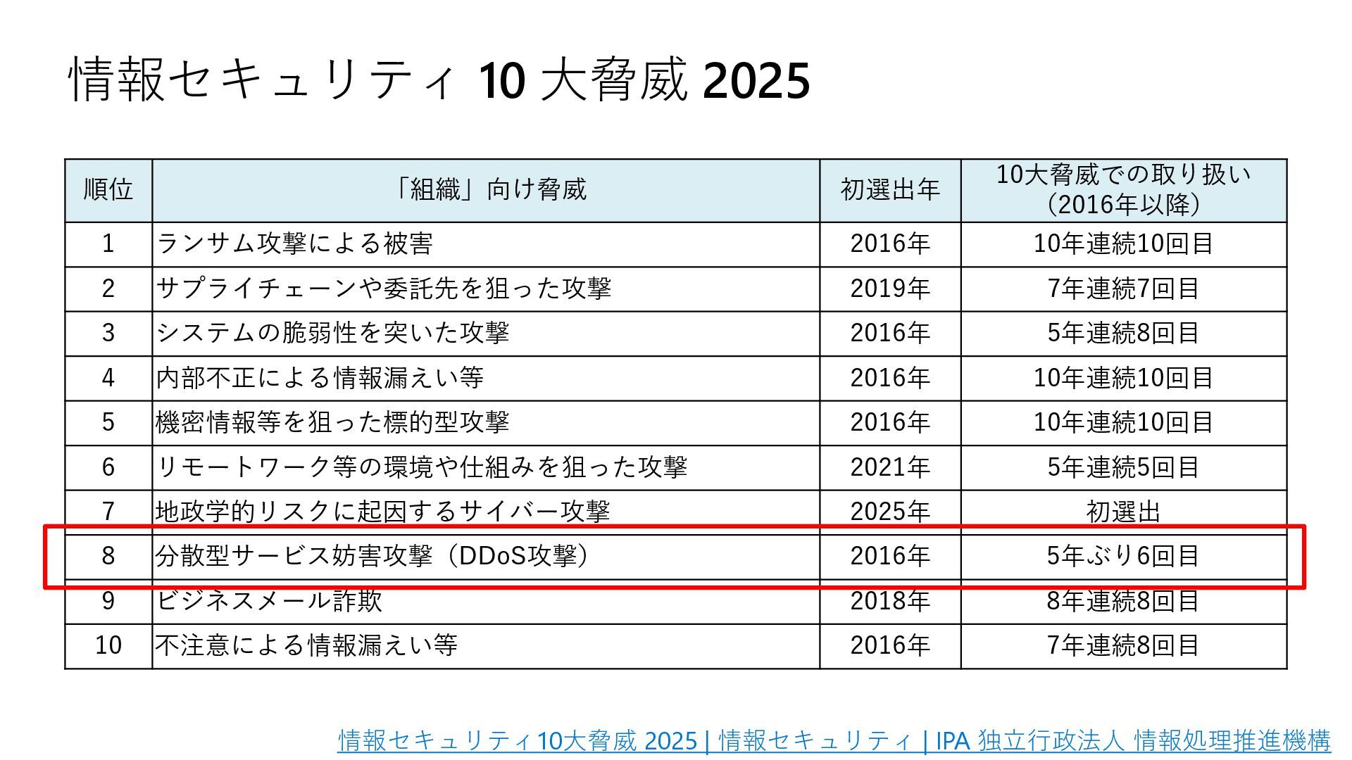 ランサム攻撃による被害 2016年 10年連続10回目 2 サプライチェーンや委託先を狙った攻撃 2019年 7年連続7回目 3 システムの脆弱性を突いた攻撃 2016年 5年連続8回目 4 内部不正による情報漏えい等 2016年 10年連続10回目 5 機密情報等を狙った標的型攻撃 2016年 10年連続10回目 6 リモートワーク等の環境や仕組みを狙った攻撃 2021年 5年連続5回目 7 地政学的リスクに起因するサイバー攻撃 2025年 初選出 8 分散型サービス妨害攻撃(DDoS攻撃) 2016年 5年ぶり6回目 9 ビジネスメール詐欺 2018年 8年連続8回目 10 不注意による情報漏えい等 2016年 7年連続8回目 情報セキュリティ10大脅威 2025 | 情報セキュリティ | IPA 独立行政法人 情報処理推進機構
