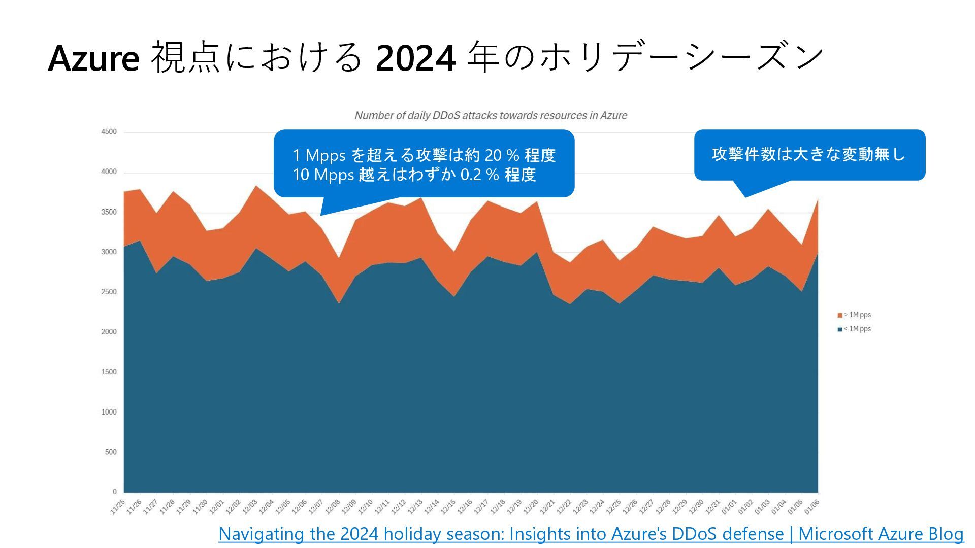 into Azure's DDoS defense | Microsoft Azure Blog 1 Mpps を超える攻撃は約 20 % 程度 10 Mpps 越えはわずか 0.2 % 程度 攻撃件数は大きな変動無し