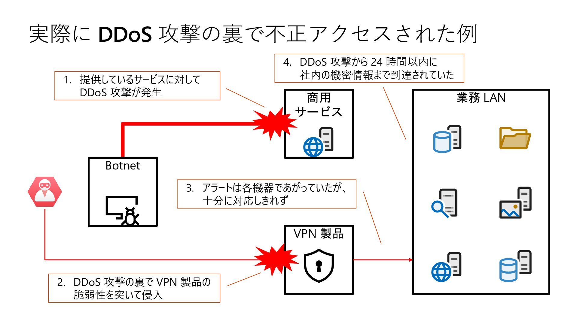 実際に DDoS 攻撃の裏で不正アクセスされた例 業務 LAN Botnet 商用 サービス VPN 製品