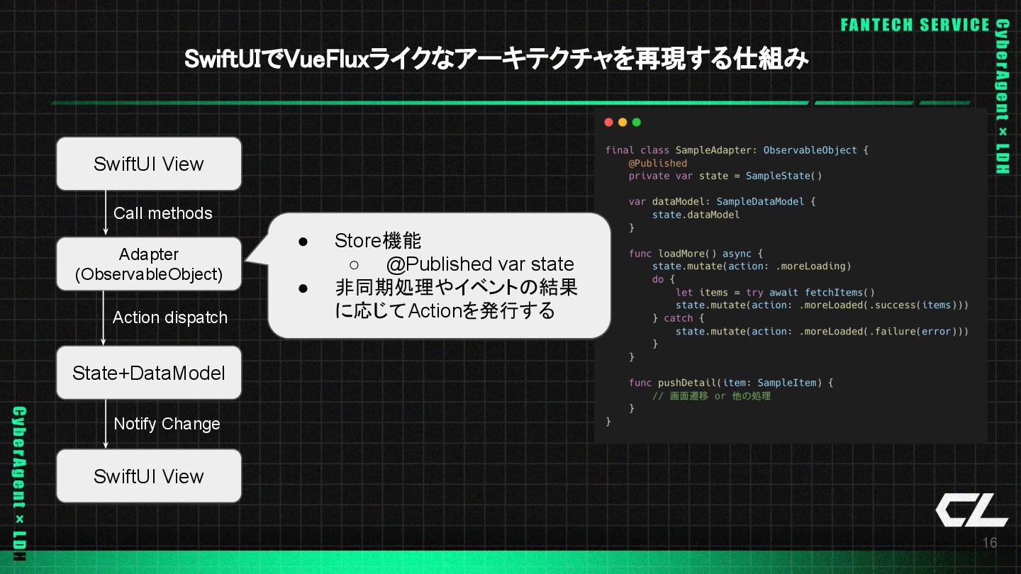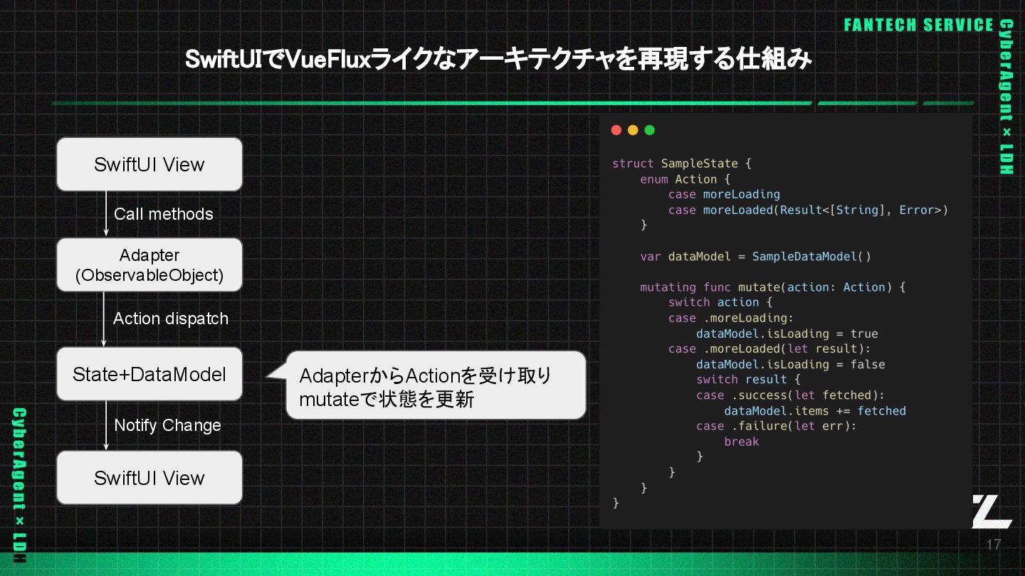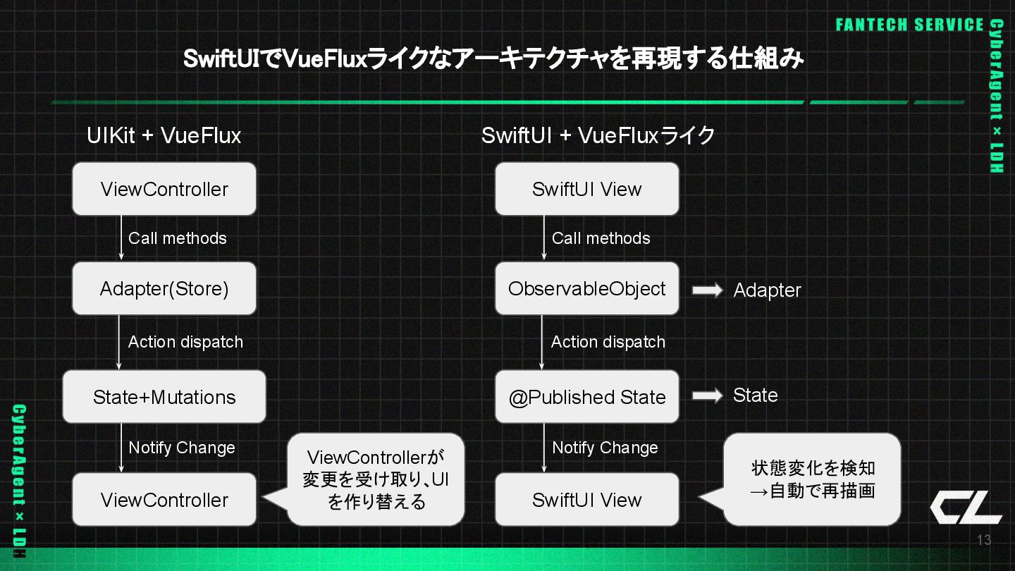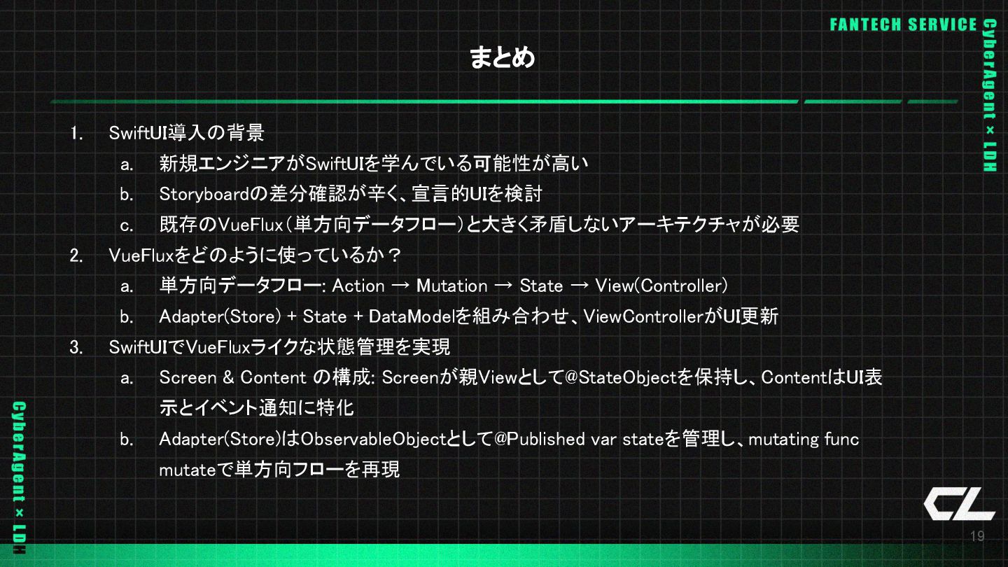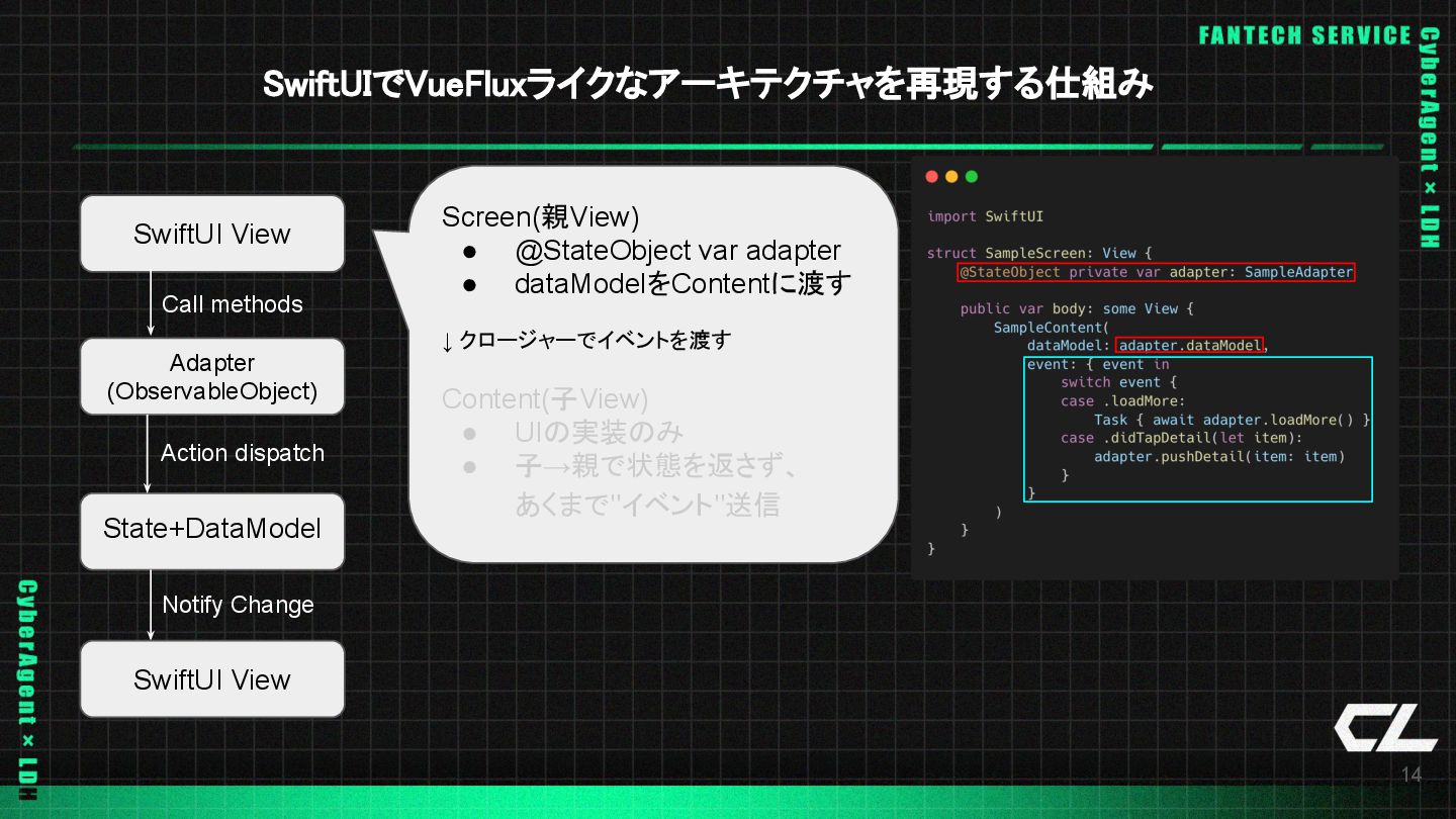 c. 既存のVueFlux(単方向データフロー)と大きく矛盾しないアーキテクチャが必要 2. VueFluxをどのように使っているか? a. 単方向データフロー: Action → Mutation → State → View(Controller) b. Adapter(Store) + State + DataModelを組み合わせ、ViewControllerがUI更新 3. SwiftUIでVueFluxライクな状態管理を実現 a. Screen & Content の構成: Screenが親Viewとして@StateObjectを保持し、ContentはUI表 示とイベント通知に特化 b. Adapter(Store)はObservableObjectとして@Published var stateを管理し、mutating func mutateで単方向フローを再現