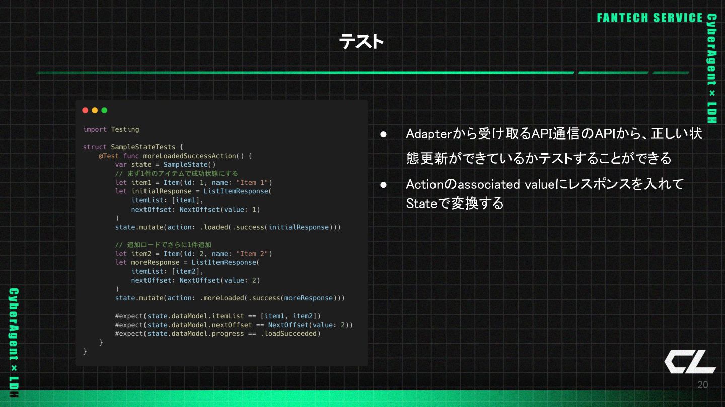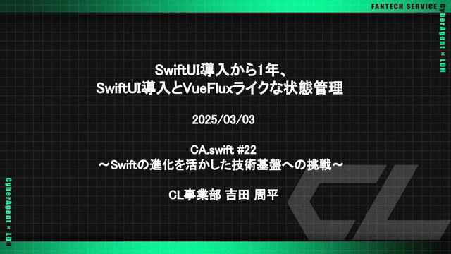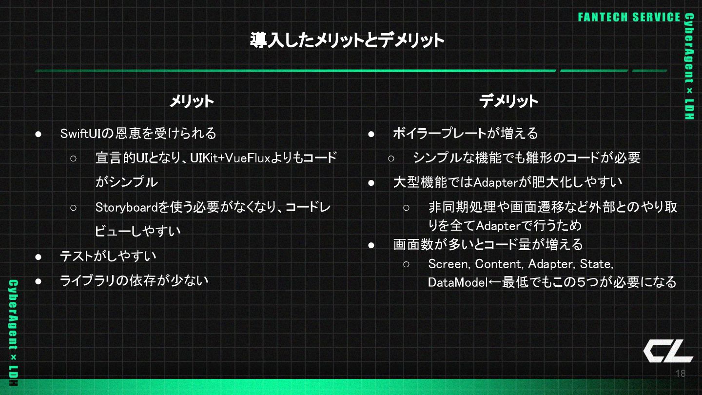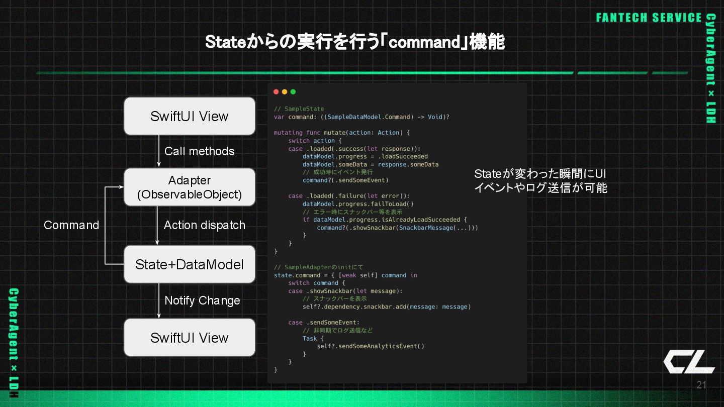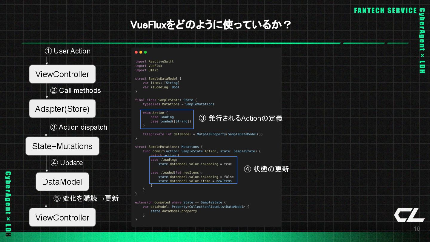 c. 既存のVueFlux(単方向データフロー)と大きく矛盾しないアーキテクチャが必要 2. VueFluxをどのように使っているか? a. 単方向データフロー: Action → Mutation → State → View(Controller) b. Adapter(Store) + State + DataModelを組み合わせ、ViewControllerがUI更新 3. SwiftUIでVueFluxライクな状態管理を実現 a. Screen & Content の構成: Screenが親Viewとして@StateObjectを保持し、ContentはUI表 示とイベント通知に特化 b. Adapter(Store)はObservableObjectとして@Published var stateを管理し、mutating func mutateで単方向フローを再現