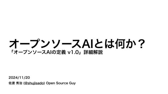 w ಛʹ௥Ճֶश༻ͷσʔληοτͷར༻Մ൱൑அɺطଘιϑτ΢ΣΞ΁ͷ૊ΈࠐΈ౳Ͱैདྷͱ͸ҟͳΔ൑அ΋͋Δ͔΋ ΦʔϓϯιʔεAIͱ͸Կ͔ʁ @shujisado, Open Source Guy wࠓ·ͰͷΦʔϓϯιʔε͸͜͏ͩͬͨ w˕ʮΦʔϓϯιʔεͱ͸ɺιϑτ΢ΣΞ౳ͷஶ࡞෺ʹ͓͍ͯɺશͯͷୈࡾऀʹର͠ɺ໨త͓Αͼར༻๏౳ͷ੍ݶ͕ͳ͘ɺ ιʔείʔυͷϨϕϧ͔Βෳ੡ɺ຋Ҋɺ൦෍ɺެऺૹ৴౳ͷ֤ࠃʹ͓͚Δஶ࡞ݖ๏͓Αͼྨࣅͷ๏্Ͱنఆ͞ΕͨݖརΛ ߦ࢖͢Δར༻ߦҝ΁ͷࣗ༝Λ༩͑ΔϥΠηϯε΋͘͠͸ͦΕΒͷϥΠηϯε͕ద༻͞Εͨιϑτ΢ΣΞͰ͋Δʯ wࠓޙ͸ԼهͷΑ͏ʹͳΔ͔΋ʁ wʁʮΦʔϓϯιʔεͱ͸ɺιϑτ΢ΣΞ౳ͷ࡞඼ʹ͓͍ͯɺશͯͷୈࡾऀʹର͠ɺ໨త͓Αͼར༻๏౳ͷ੍ݶ͕ͳ͘ɺι ʔείʔυͷϨϕϧ͔Βෳ੡ɺ຋Ҋɺ൦෍ɺެऺૹ৴౳ͷ֤ࠃʹ͓͚Δஶ࡞ݖ๏͓Αͼྨࣅͷ๏্Ͱنఆ͞ΕͨݖརΛߦ ࢖͢Δར༻ߦҝ΁ͷࣗ༝Λ༩͑Δ๏త৚݅΋͘͠͸ͦΕΒͷ๏త৚͕݅ద༻͞Εͨ࡞඼΋͘͠͸ߏ଄Ͱ͋Δʯ